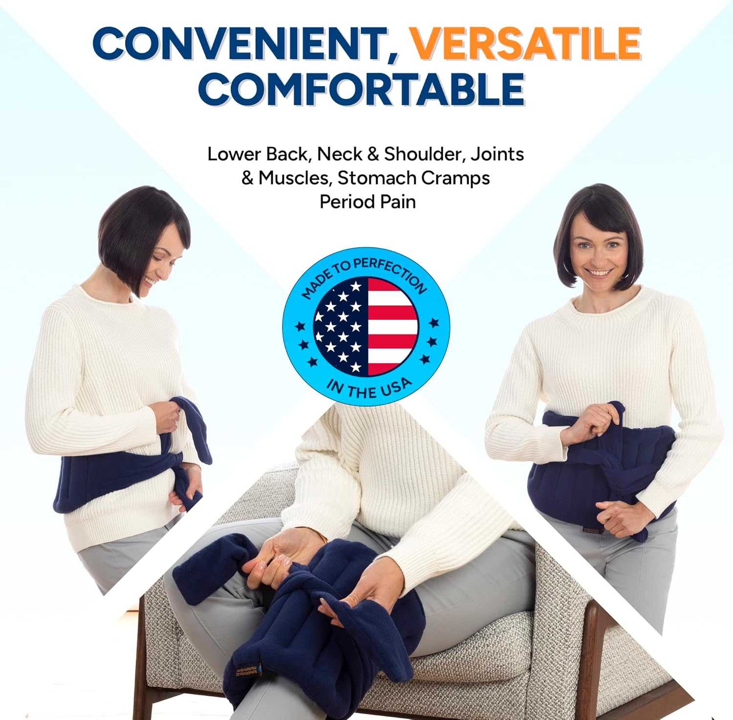 - MOLDABLE FLAXSEED FILLING: Stuffed with US-grown human-grade flaxseeds for ideal moldability, the form-conforming beanbag pad hugs your contours, fitting perfectly anywhere you need. Rest your head back and use as a neck heating pad for neck pain, wear over the shoulders for rotator cuff injuries, or tie around your waist for back or abdomen discomfort.