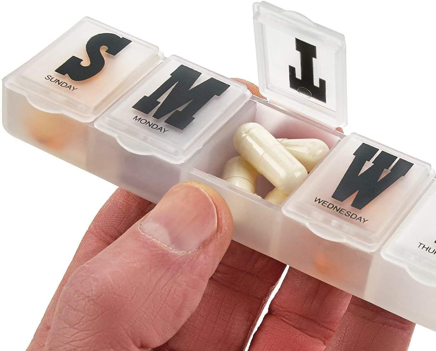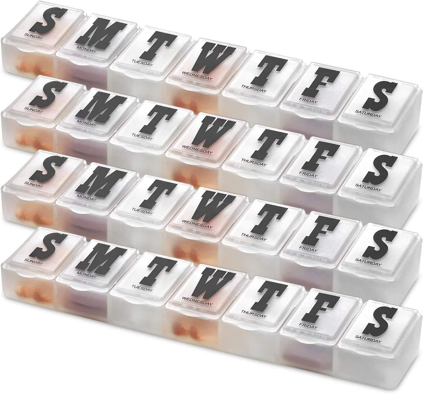 - USER FRIENDLY! EASY TO READ JUMBO LETTERS: The bold Monday-to-Sunday markings on each pill case are ideal for assisting you to allocate the medications of an entire week in order. When it comes to your medication organizer we want to make sure you avoid mixing up medication when taking your pills of one day.