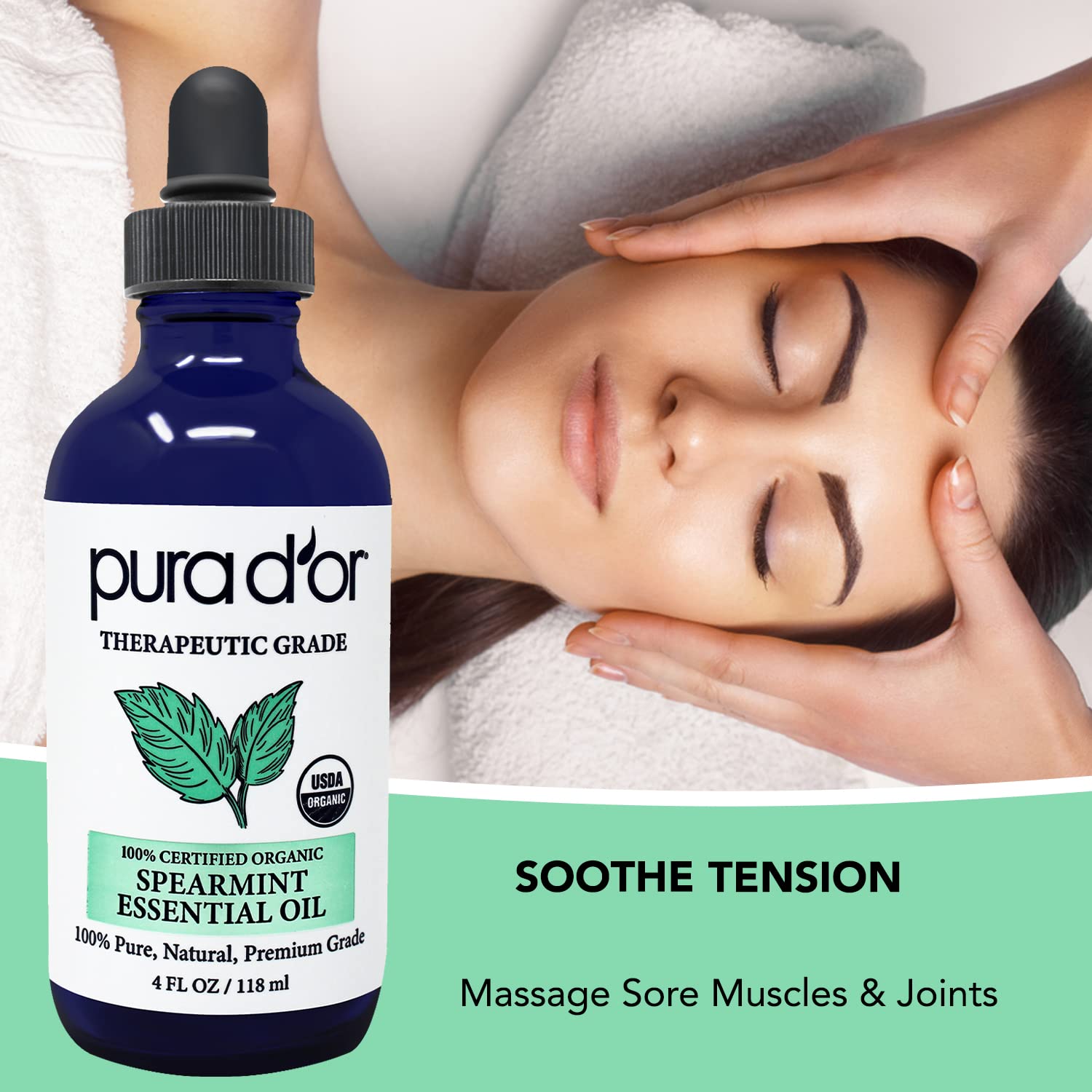 PURA D'OR Organic Spearmint Essential Oil (4oz with Glass Dropper) USDA Certified 100% Pure & Natural Therapeutic Grade Diffuser for Aromatherapy, Focus, Concentration, Mood Uplift
