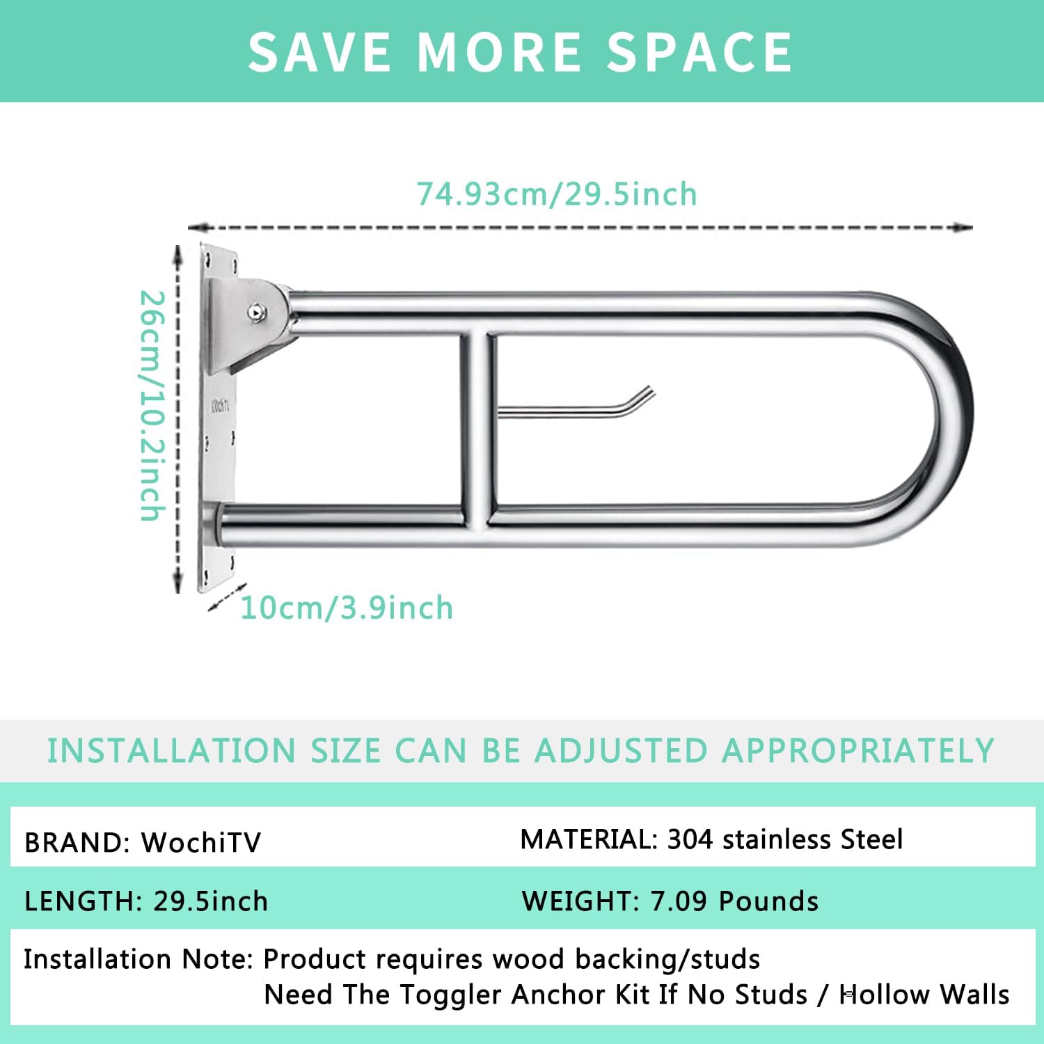 29.5 INCH Stainless Toilet Safety Rails,Disabled Flip-Up Bathroom Grab Bar with Paper Holder,Toilet Handrails Hand Grips Handle Shower Assist Aid, WochiTV Handicap Grab Bars for Elderly