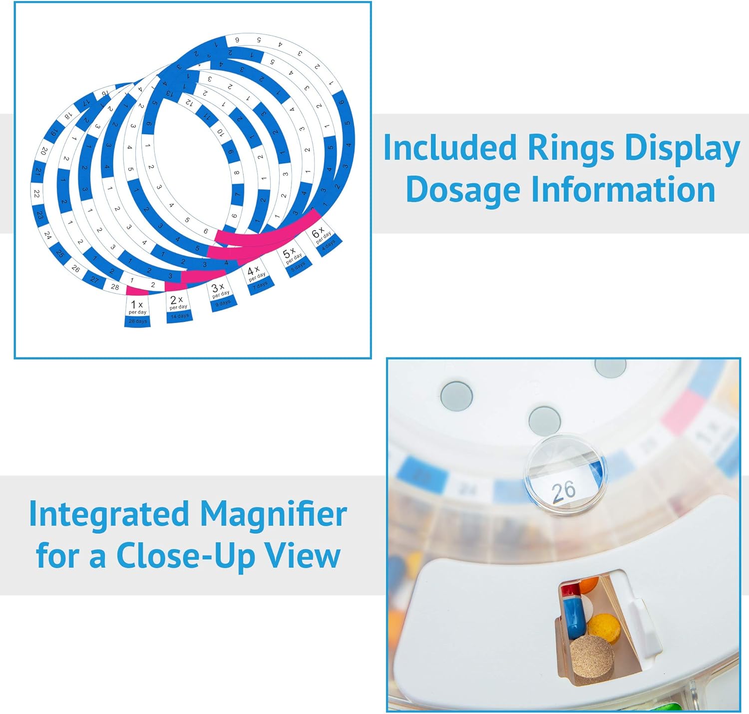 - 6 INTERCHANGEABLE DOSAGE RINGS | Templates Help Improve Accuracy & Prevent Missed or Accidental Double Doses | High-Capacity Slots Fit Up to 18 Pills Each for Minimal Refills & Maximum Efficiency