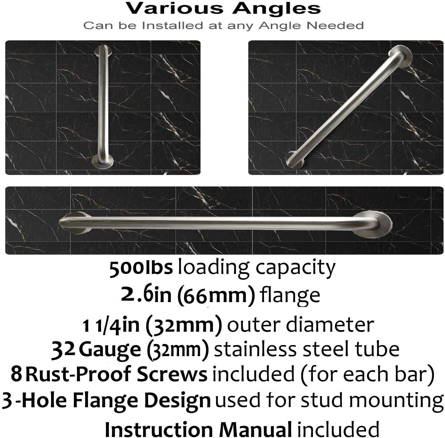 - Able to support up to 500 lbs of pull force to provide a stable, reliable handhold; 2.6inch(66mm) flange; 1 1/4inch (32mm) outer diameter; 32 gauge (32mm) stainless steel tube; 8 rust-proof screws included(for each bar); 3-hole flange design used for stud mounting.