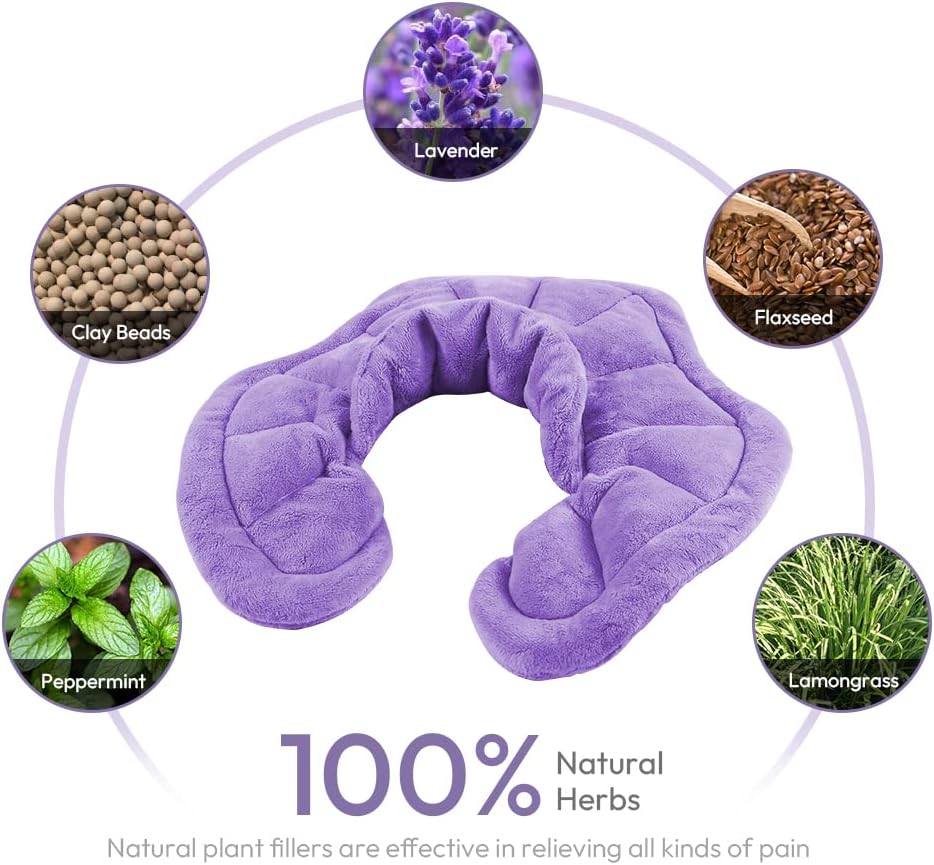 - FILLER HERBS HEAT PAD: Heated neck wrap filled with flaxseed, lavender, peppermint, lemongrass, clay beads to reduce stress and help you relax. Minky fabric moist heating pad cover is soft to the touch and conforms to your neck and shoulders to give you full comfort coverage.