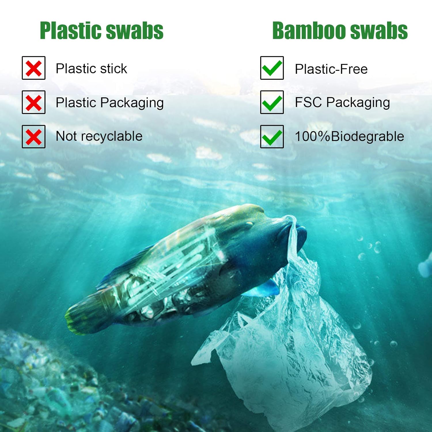 - MATERIAL. The cotton swabs are made of 100% natural cotton and bamboo. Total no plastic, no dyes, no chemicals, alternative to ordinary cotton buds, which harms our nature.