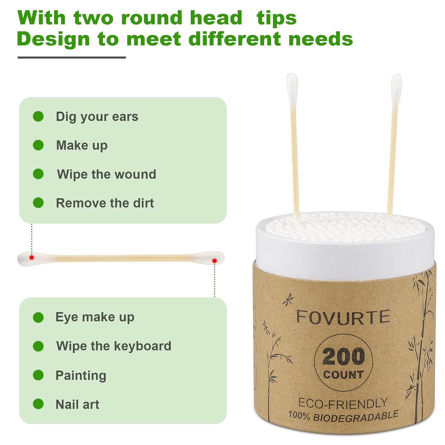 - PACK OF 400 & UNIQUE DESIGN. Our bamboo cotton swabs for ears includes 400 count cotton swabs (2 boxes of 200 pcs). With two round tips design, it works well for making up detail or doing some precise things.