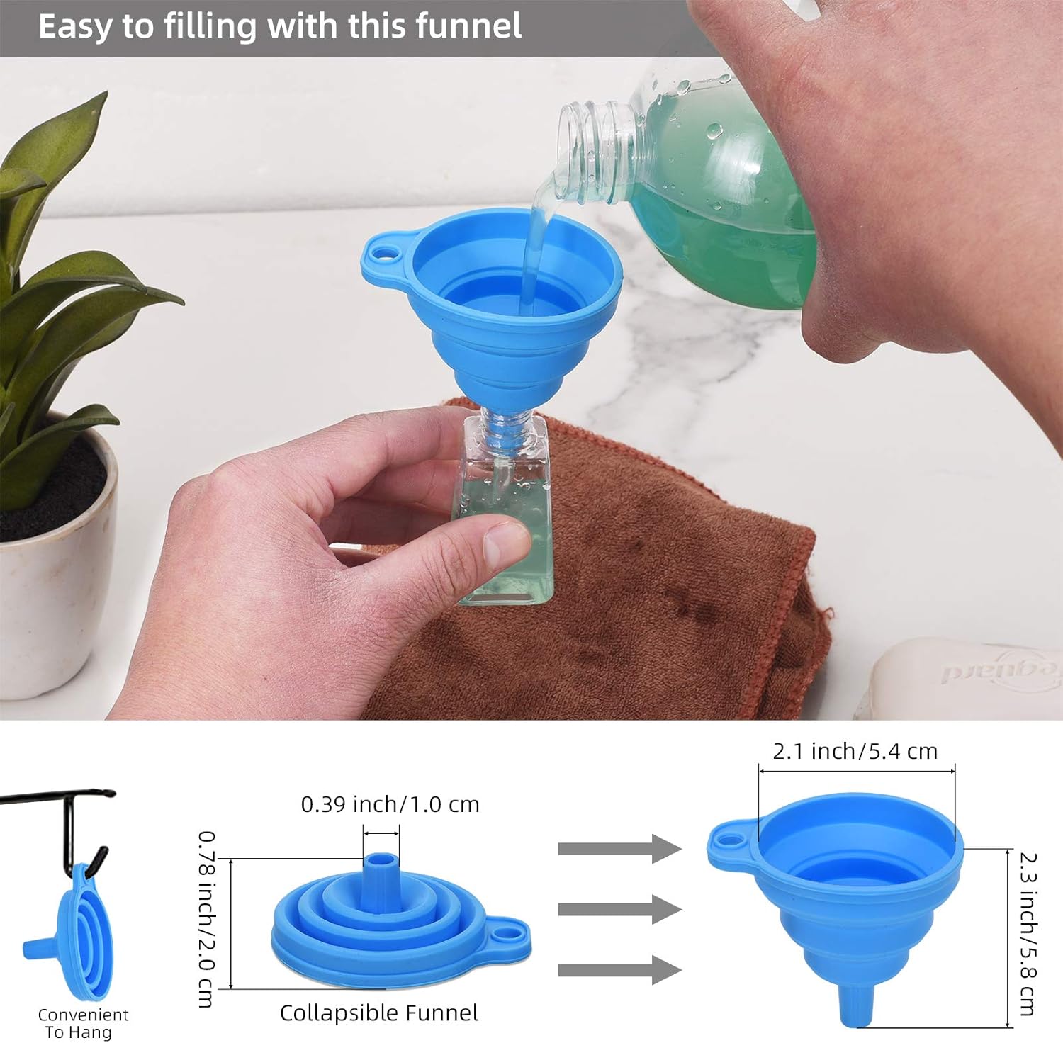 - EASY TO FILLING WITH FUNNEL:Are you troubling how to filling sanitizer??? This hand sanitizer travel size keychain comes with a collapsible funnel,so it is easy to fill the gel sanitizer from the large container to these travel size bottle and convenient to hang.