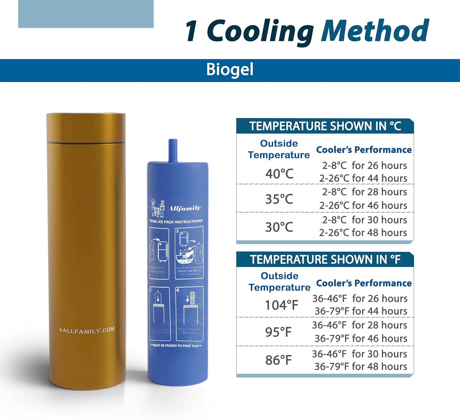 4ALLFAMILY Nomad Insulin Travel Case Cooler – 48H Non-Electric Insulin Cooler Travel Case TSA Approved with Lightweight Design – Air Traveling Friendly, Reusable Medium Gold Thermo for Medications