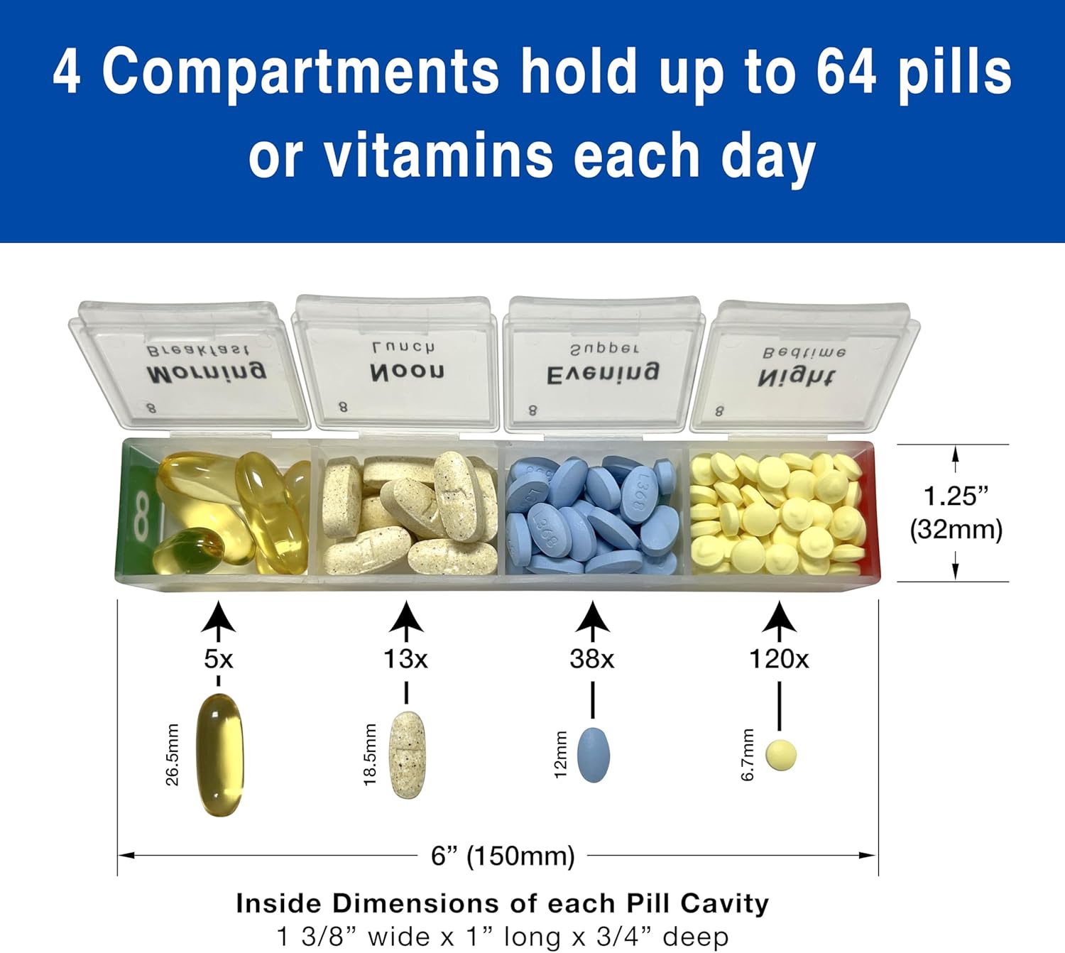 - 4 PILL COMPARTMENTS: Daily pill boxes have 4 compartments (morning, noon, night, evening) and can hold up to 64 pills or vitamins each day. Easy open pill box lids feature a simple to use safety catch to prevent the pills from falling out when the pill boxes are transported and/or stored and allows for easy access to needed medications.
