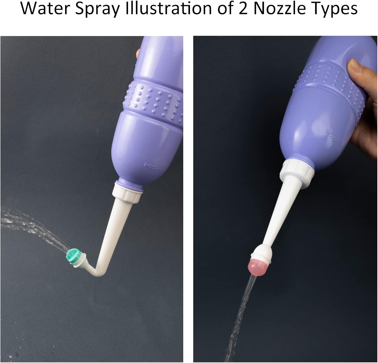 - 2 Nozzle Types that Fulfill Different Cleaning Needs - Please note, for “Pack of 1”, the peri bottle comes with only 1 angled nozzle, for “Pack of 2“, each peri bottle comes with 1 angled nozzle and 1 straight nozzle. Wide-spraying angled nozzle is more suitable for perineal cleaning with the bottle held upside down and can get perfect aim for hard-to-reach areas, fast-spraying straight nozzle can be used for a quick wash for baby buttocks after pooping.