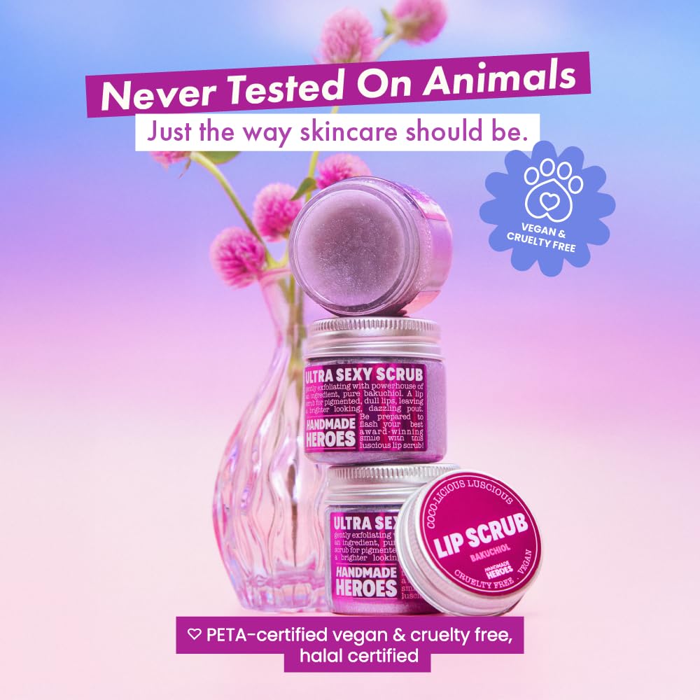 - SMOOTH SOFT LIPS: Handmade Heroes renewing Bakuchiol lip sugar scrub gently buffs away dry flaky skin, lip lines and wrinkles, restoring smooth and supple lips. Natural lip exfoliant safe for sensitive skin