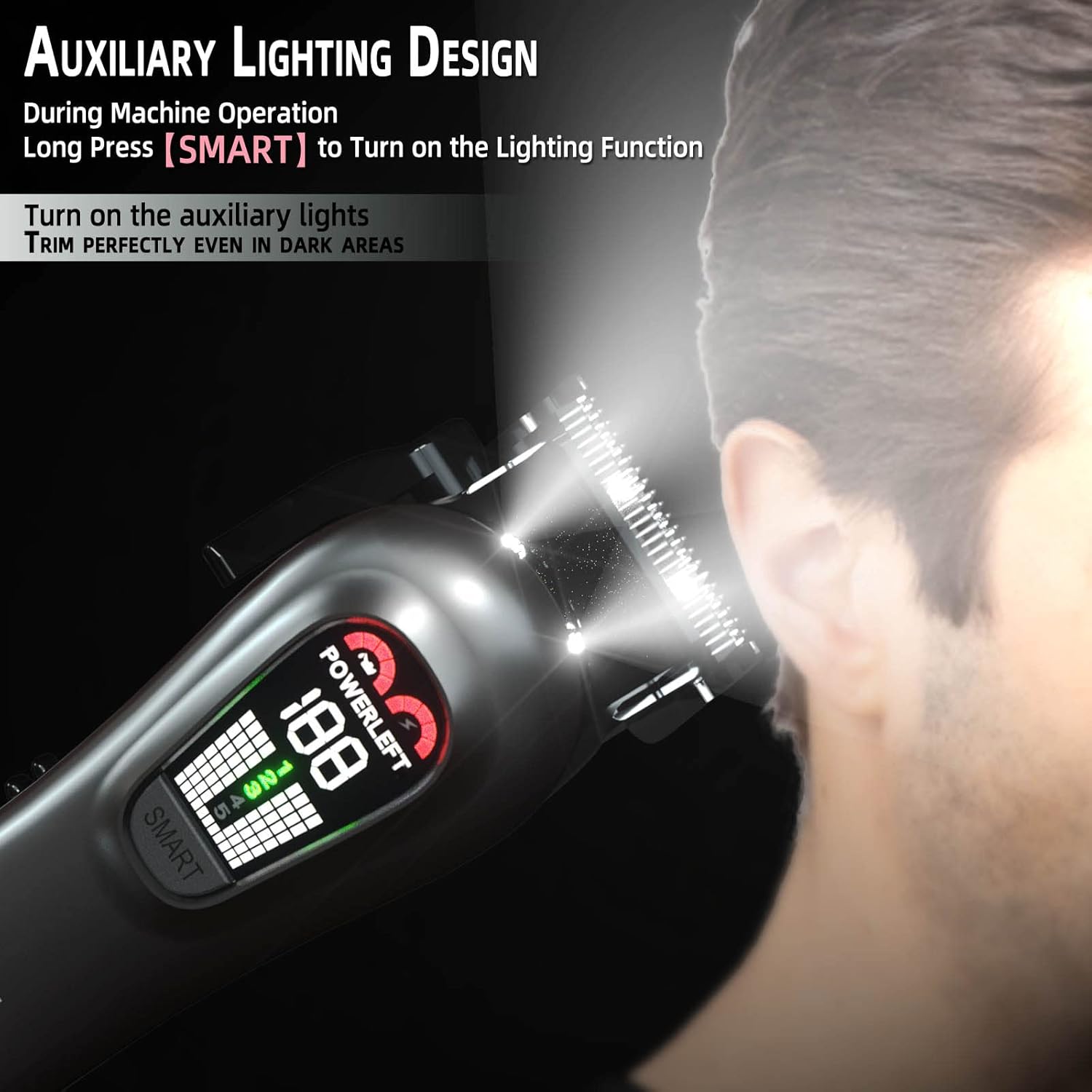 - Auxiliary Lighting The TCMKY hair clipper is equipped with a suitable lighting option which is located at the head of the hair clipper. Push the power switch upward to start the hair clipper and then press and hold the SMART button for 3 seconds to turn on the lighting function. When traveling you can efficiently trim even without lighting.