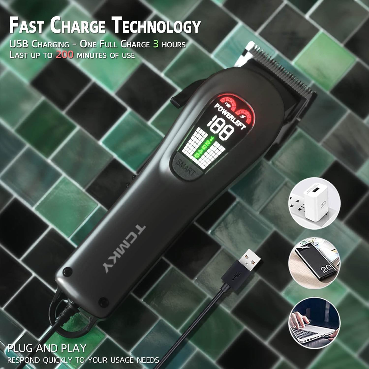- CORDLESS&CORDED TCMKY Hair trimmer can be with cord or cordless which is super convenient for self cutting. USB charging 3Hours One full charge Last up to 200 minutes of use.When the power of the hair clipper is used up This hair trimmer supports plug and play.When charging The charging capacity can be seen from the display.When the power in the display screen is 100% unplug the power cord