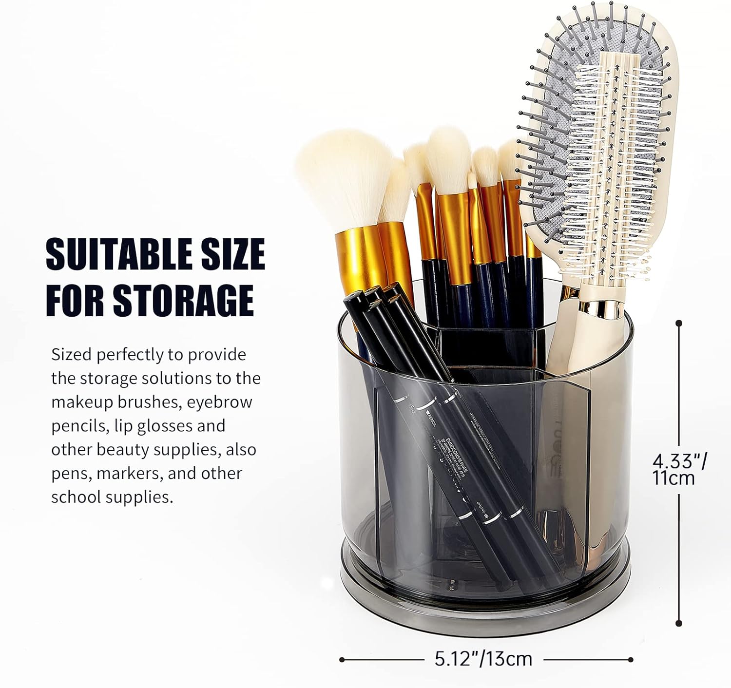 Makeup Brush Holder Organizer -Rotating 360° Clear Storage Cup Containers for Vanity, Desk, Countertop, Spinning Pen Holder for Desk, Round Make up Brush Stand with 5 Slots, for Cosmestics (Grey)