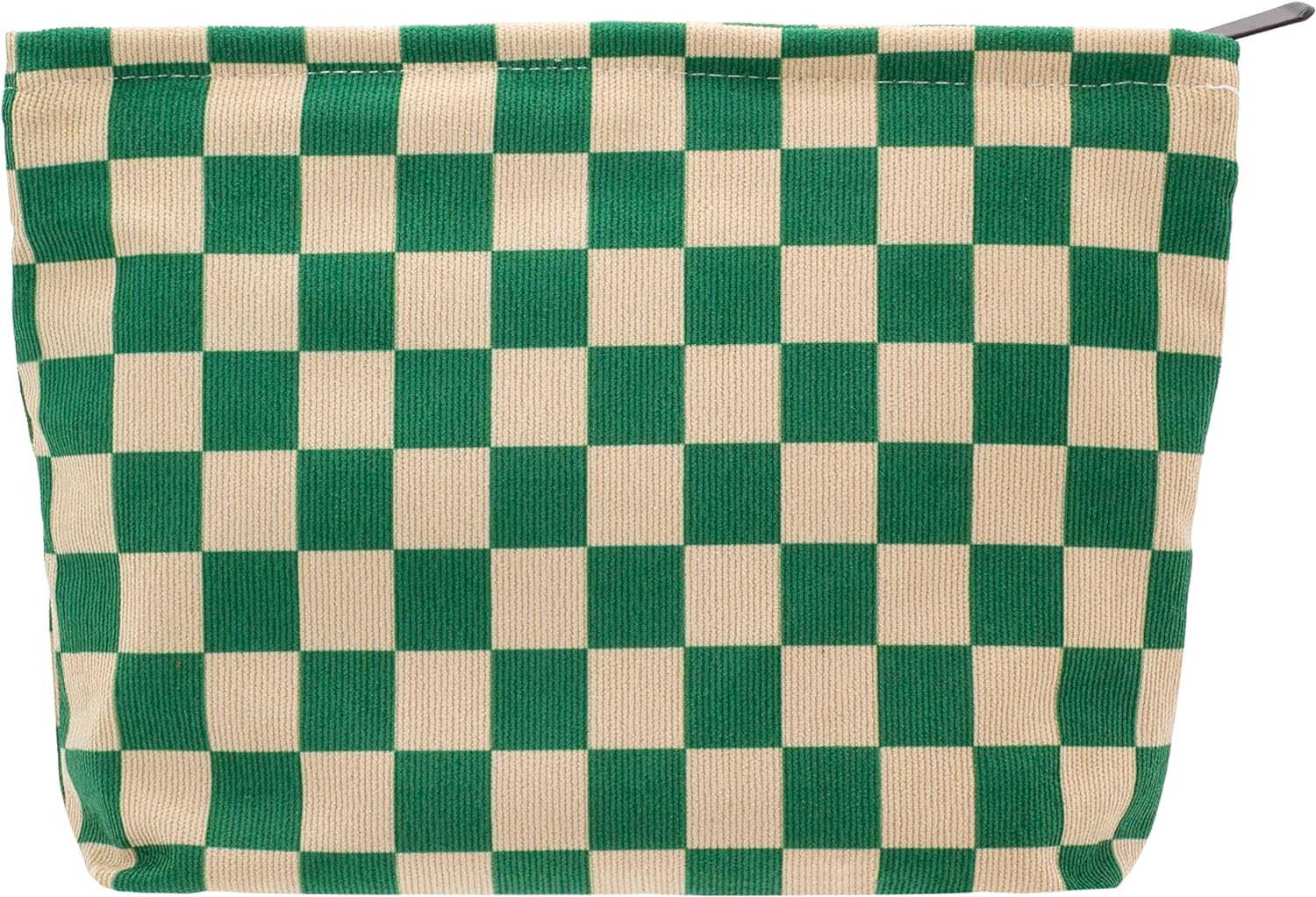 PAZIMIIK Makeup Bag Large Zipper Corduroy Make Up Pouch for Purse Travel Canvas Cosmetic Organizer for Women Brush Storage,Checkered Green