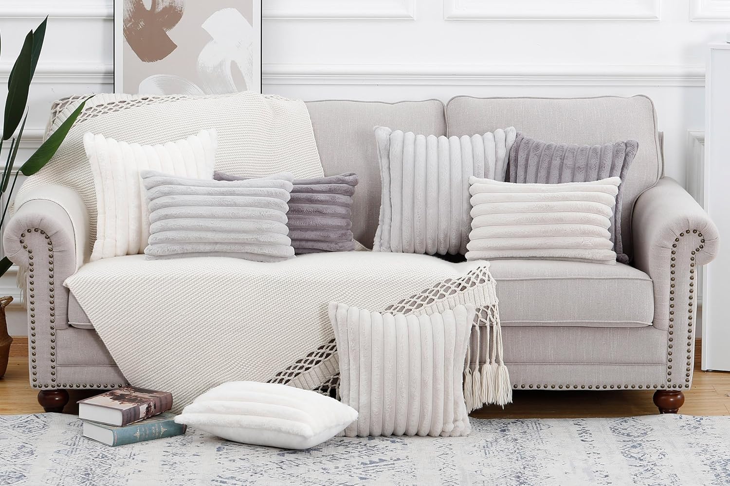 MADIZZ Set of 2 Faux Wool Plush Decorative Throw Pillow Covers 12x20 Inch Light Grey Fluffy Striped Soft Decorative Cushion Cover for Sofa Bedroom Pillow Shell