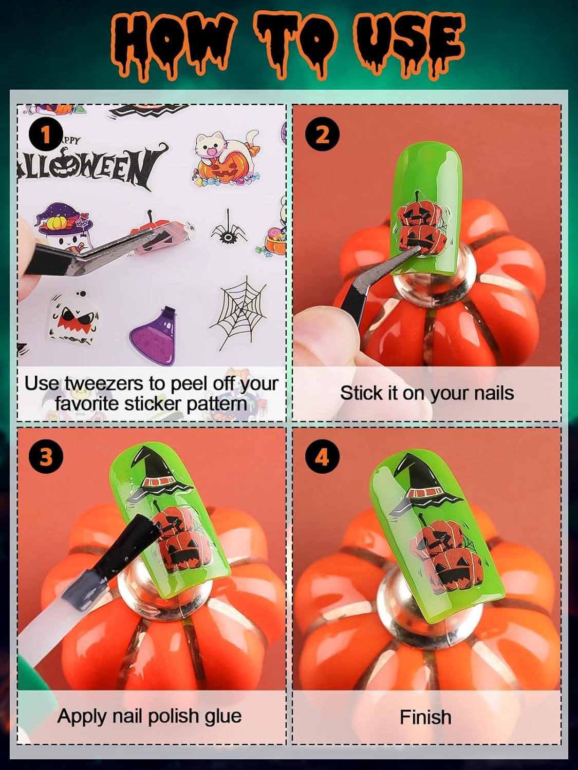 - 【Easy to Use】3D Self-adhesive Halloween nail stickers make it easy to stick well on your nail. Just use tweezers to peel and stick it on your nail. We suggest you can also use nail gel top coat to cover to make the stickers last longer. These are NOT water transfer ones!