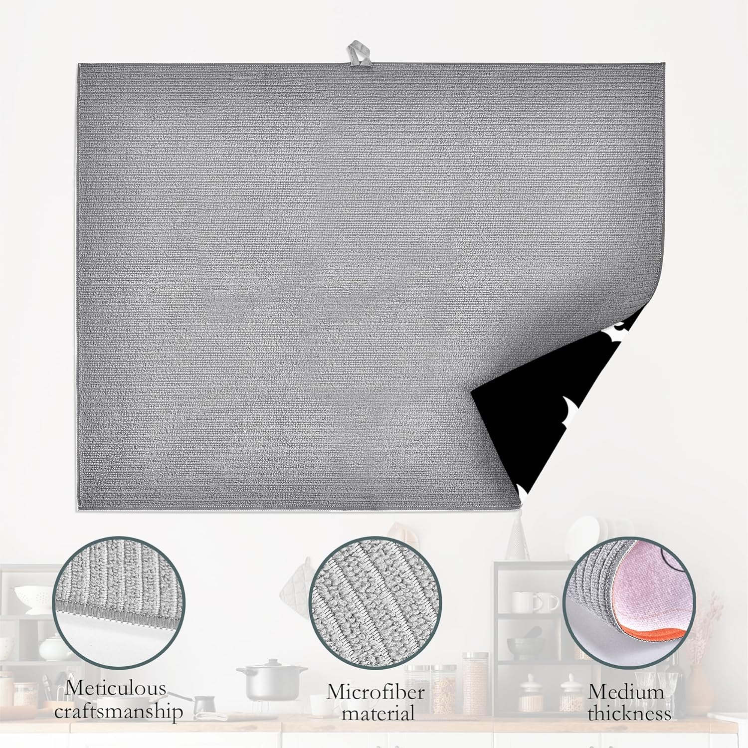 - DESIGN: Reversible with a different design on each side.The dish drying mat with hanging loop, can be hung on the kitchen wall. Soft and foldable, easy to store in any drawer, cabinet, or closet. Microfiber is naturally, long lasting, and cleans up easily, and is effortless to clean.