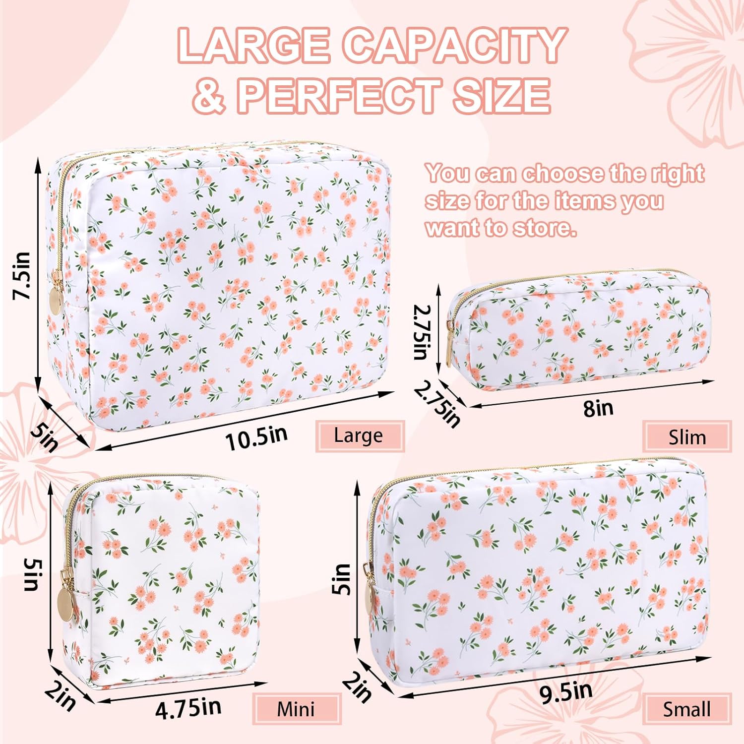 Waterproof Large Floral Makeup Pouch,Nylon Travel Toiletry Storage Purse Preppy Cosmetic Bag for Women Girl,Large Capacity Makeup Organizer Zipper Pouch for Work(L White-Flowers)
