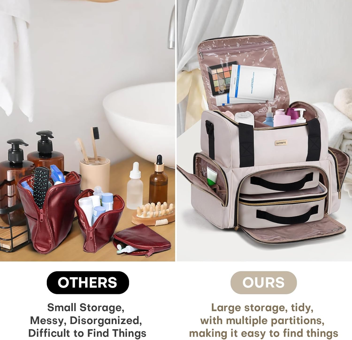 - 3 CARRYING OPTIONS :Wrapped top handles, adjustable & padded shoulder straps, and back luggage strap makes it convenient to carry the makeup organizer bag to a party, wedding, fashion show, bathroom, camp, or traveling