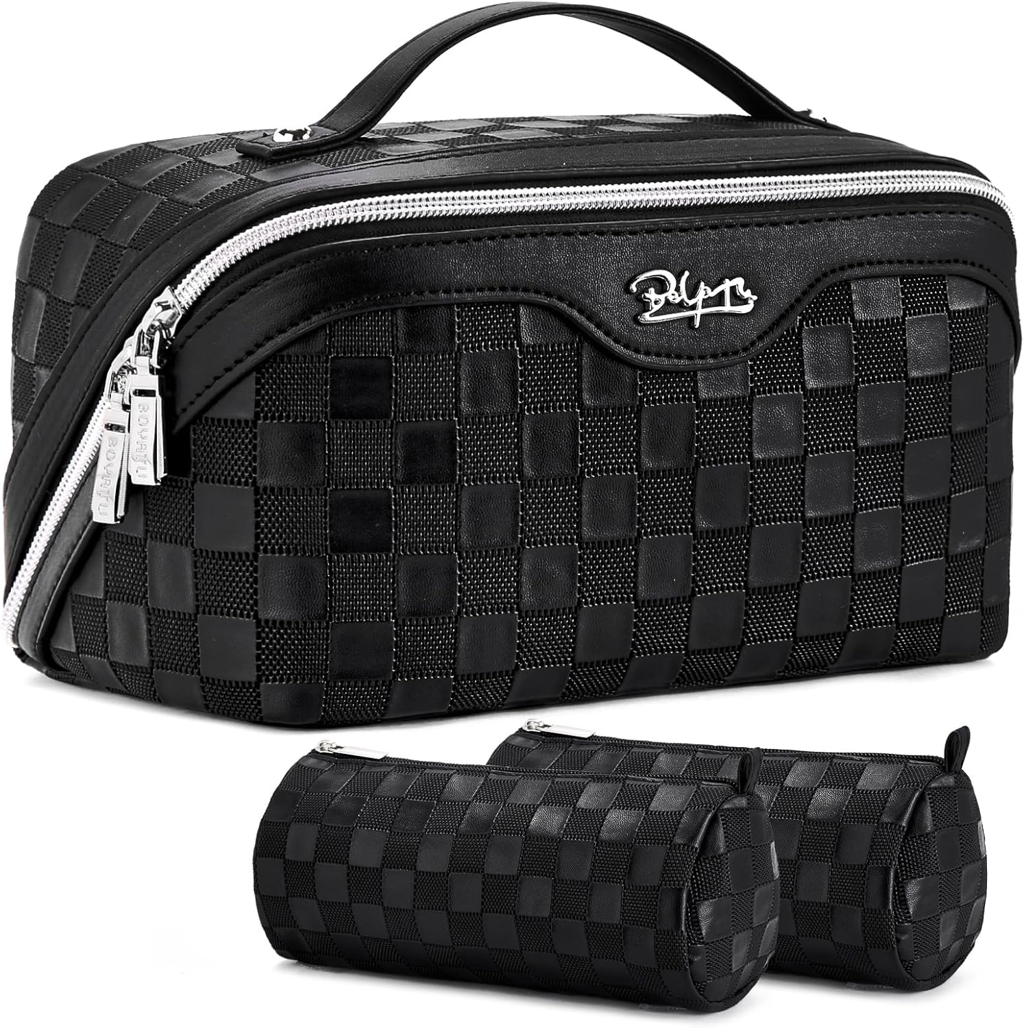 BOYATU Travel Makeup Bags for Women: Vegan Leather Cosmetic Bag Set of 3 - Large Capacity Make up Bag with Divider - Wide Open Waterproof Toiletry Organizer Bag with Handle (L13-Black)