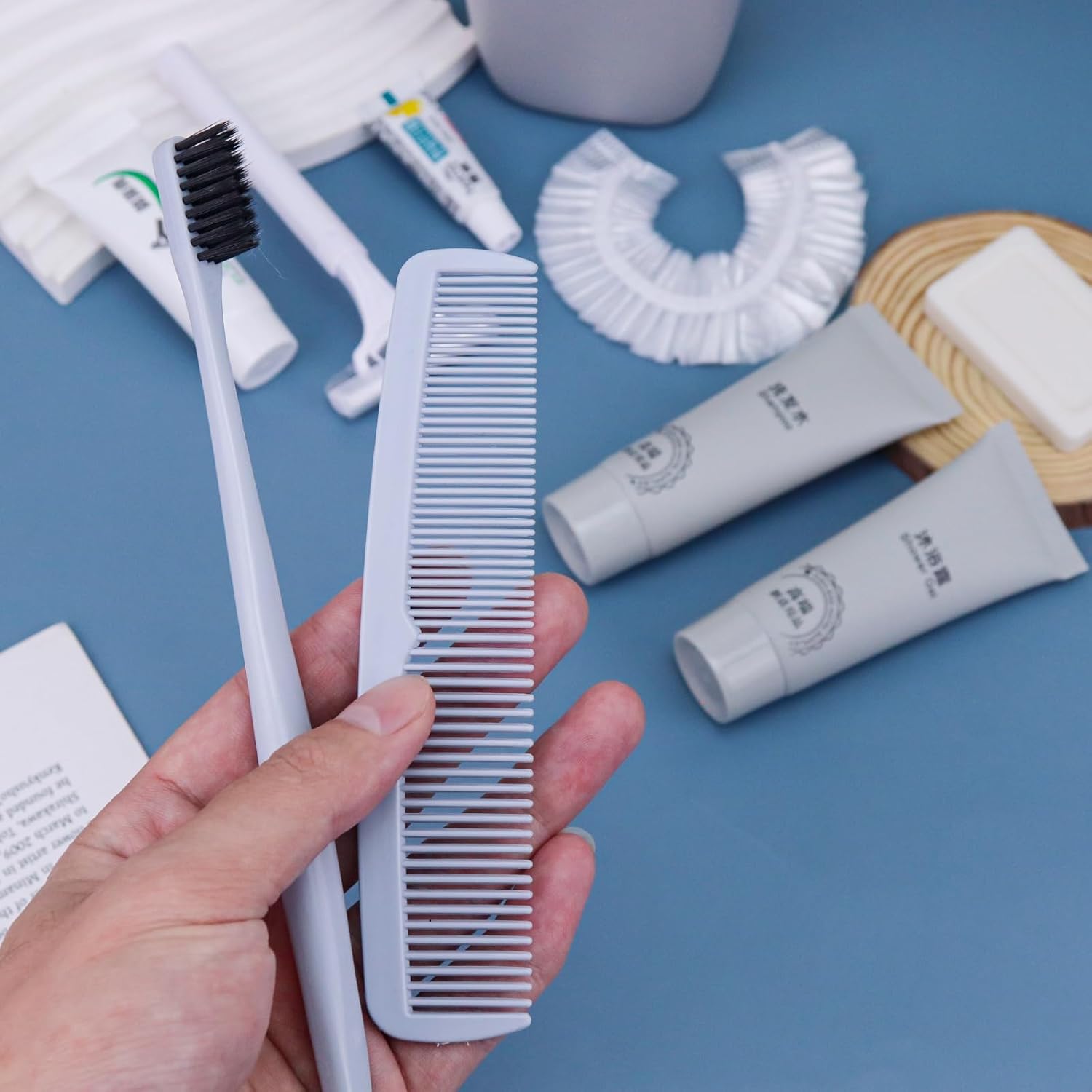 - More sets to match: our hygiene travel kit comes in a pack of 25 sets. Each travel size hygiene products bulk set consists of a Toothbrush, toothpaste, shaver, Shaving cream, comb, bath gel, shampoo, soap and bath cap. 9 items in a set. personal care travel size toiletries make it even more comprehensive, convenient and comfortable to use.