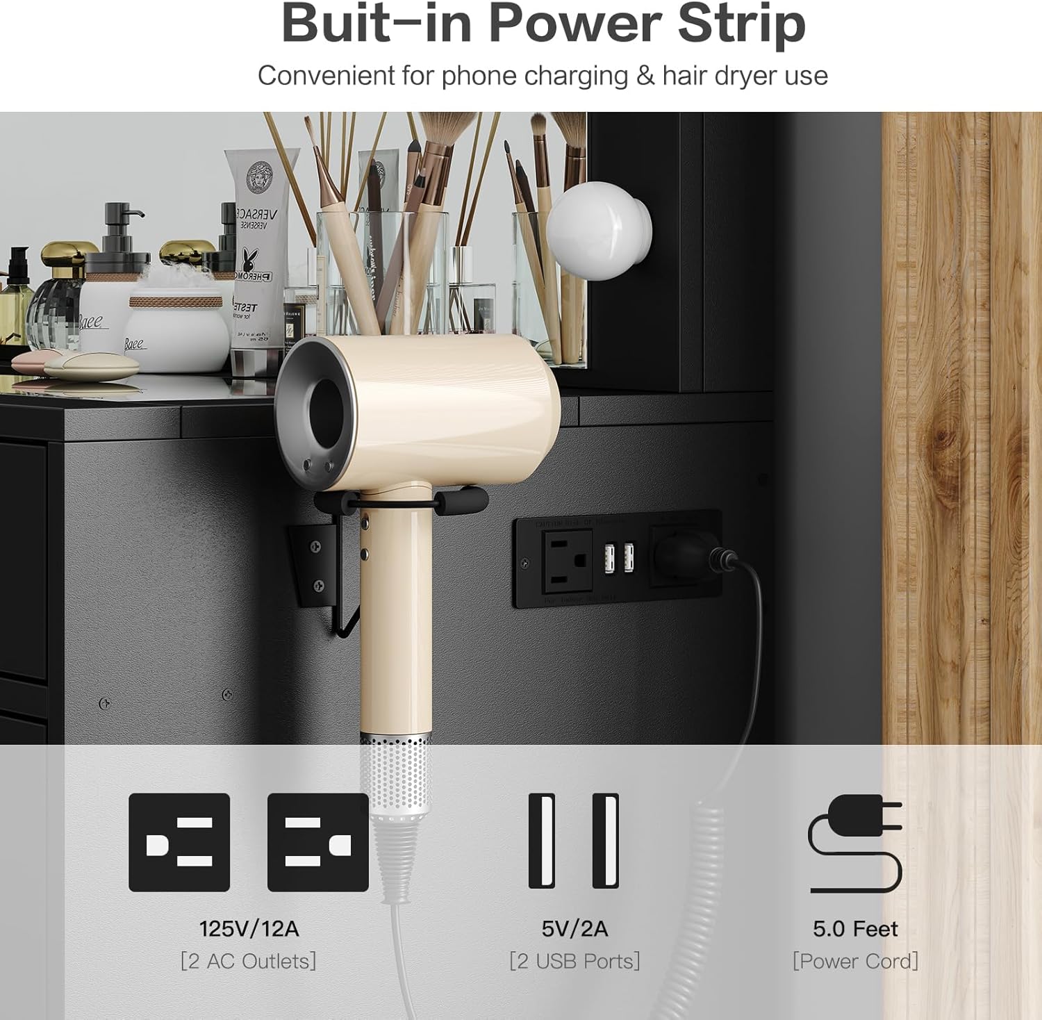 - Vanity Table with charging station: This vanity table comes with a charging station and hair dryer holder, including 2 standard plug sockets and 2 USB ports, which can more conveniently connect hair dryers and curling irons, and can also provide power for your mobile phone, tablet or other devices to charge your mobile device, allowing you to take beautiful selfies after applying makeup