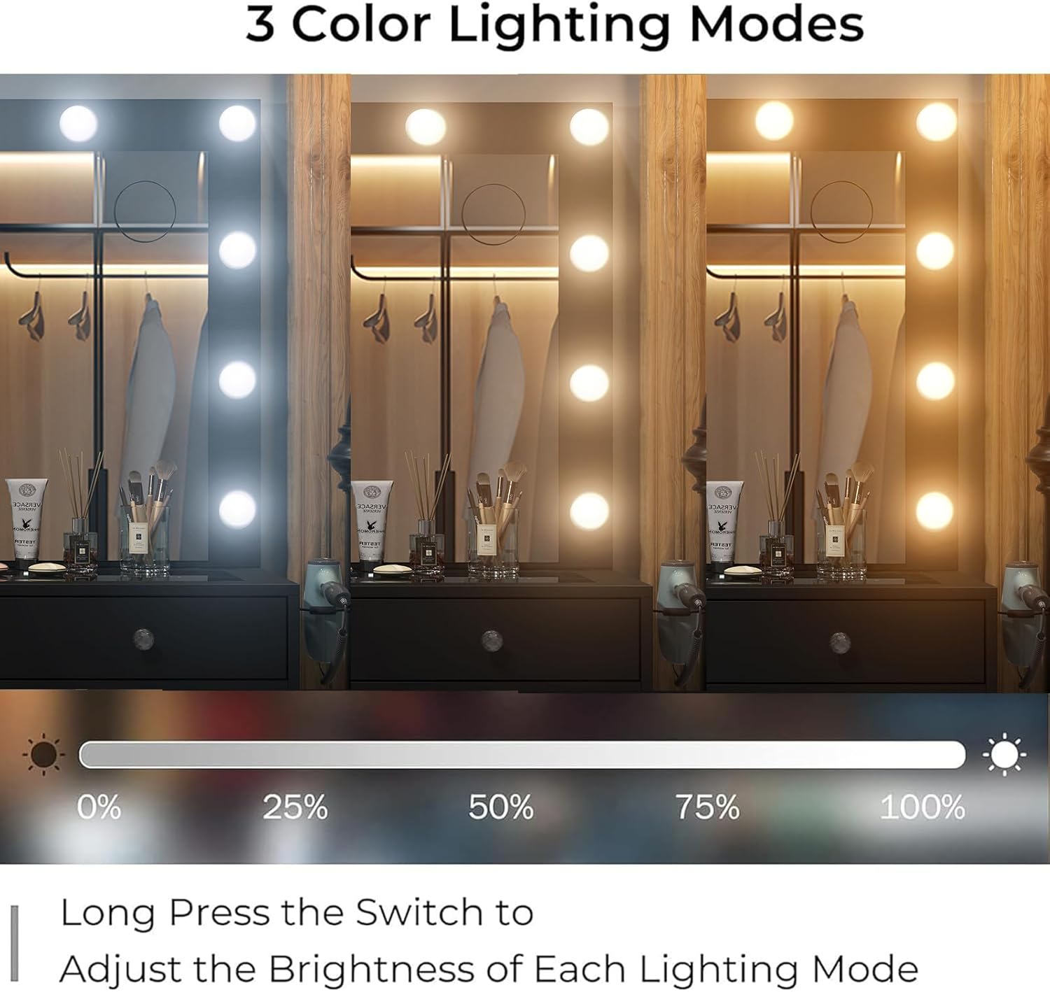- 3 Lighting Modes & Brightness Adjustable: The vanity desk is equipped with an HD mirror and 11 bright Hollywood plastic bulbs, provides 3 color modes (warm/natural/cool) and adjustable brightness, this makeup vanity can meet all your different needs, perfect for home makeup, salon, and live broadcast., so you can experience the star-like makeup treatment.