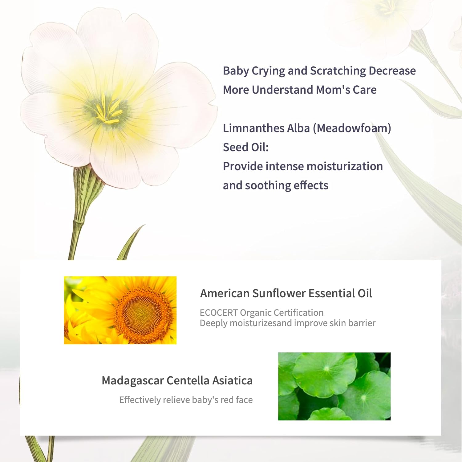 - High Moisture Retention:Abundant oily ingredients lock in moisture, ensuring long-lasting hydration for baby’s delicate skin. A gentle, moisturizing, and soothing formula that addresses redness, dryness, and sensitivity. Tocopherol (Vitamin E): Helps maintain skin barrier integrity, reduces the impact of external factors like air pollution, and offers moisturizing benefits.