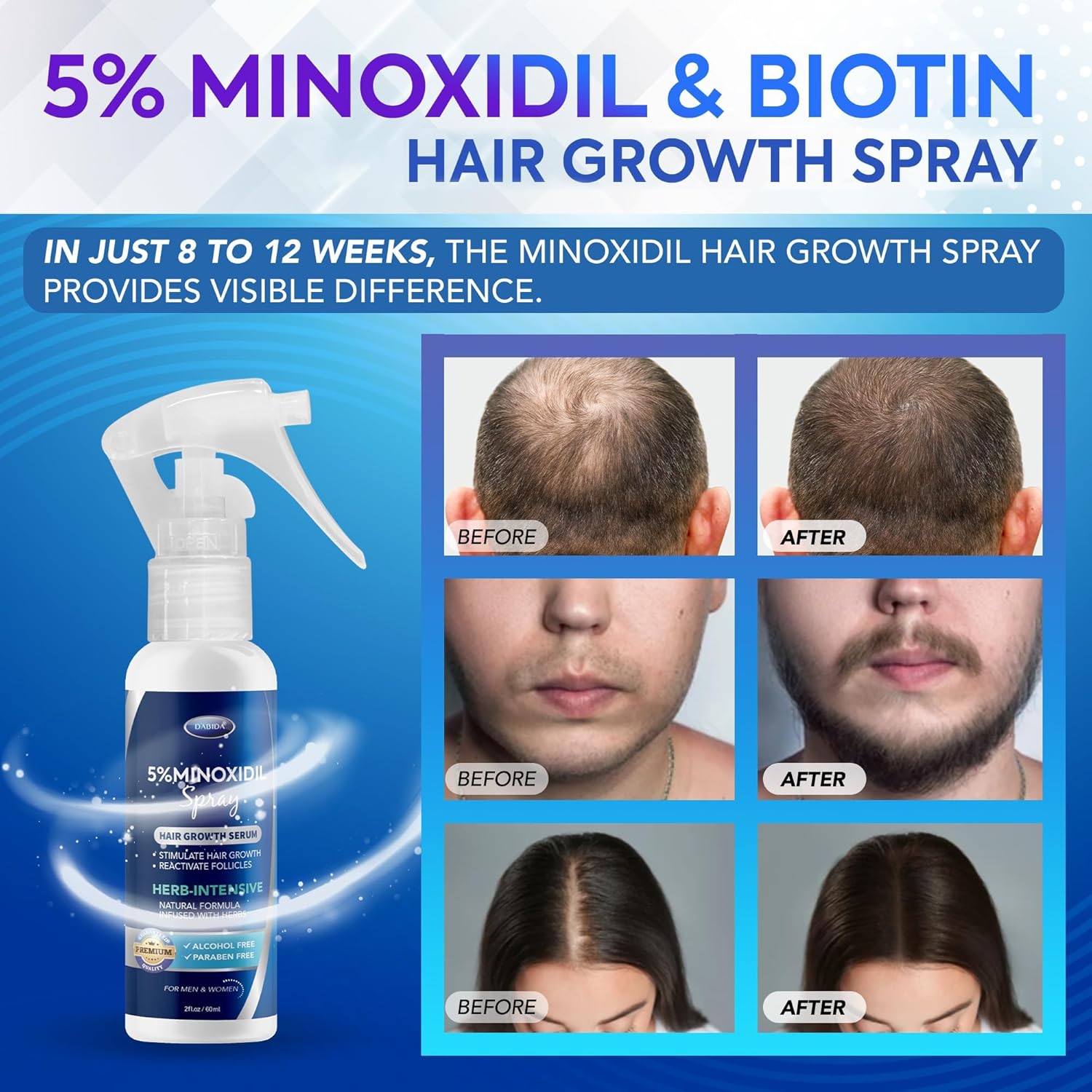 - Minoxidil for Men and Women - DABIDA Minoxidil spray strengthens thinning and weak hair resulting in noticeably thicker, fuller, and younger-looking hair. Biotin, a B complex vitamin, helps stimulate hair growth, causing hair to thicken and appear healthier while growing more quickly and sustainably.