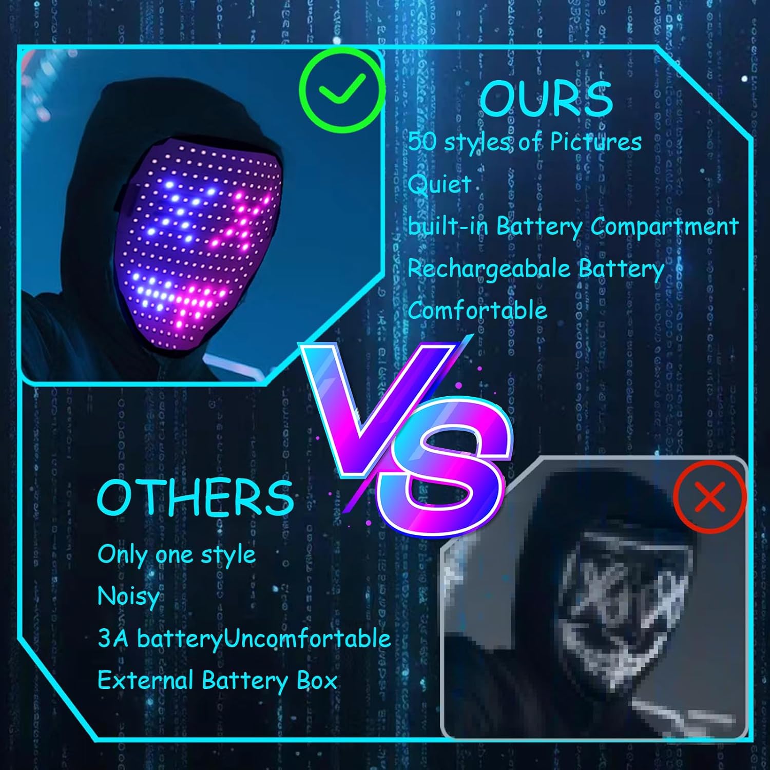 - Led Mask With 50 Patterns:Light up mask has 25 groups of dynamic patterns and 25 groups of static patterns, using higher gloss 234 pieces of 2727RGB led light beads, the color is shiny, Satisfy your pursuit of ultimate personalization.