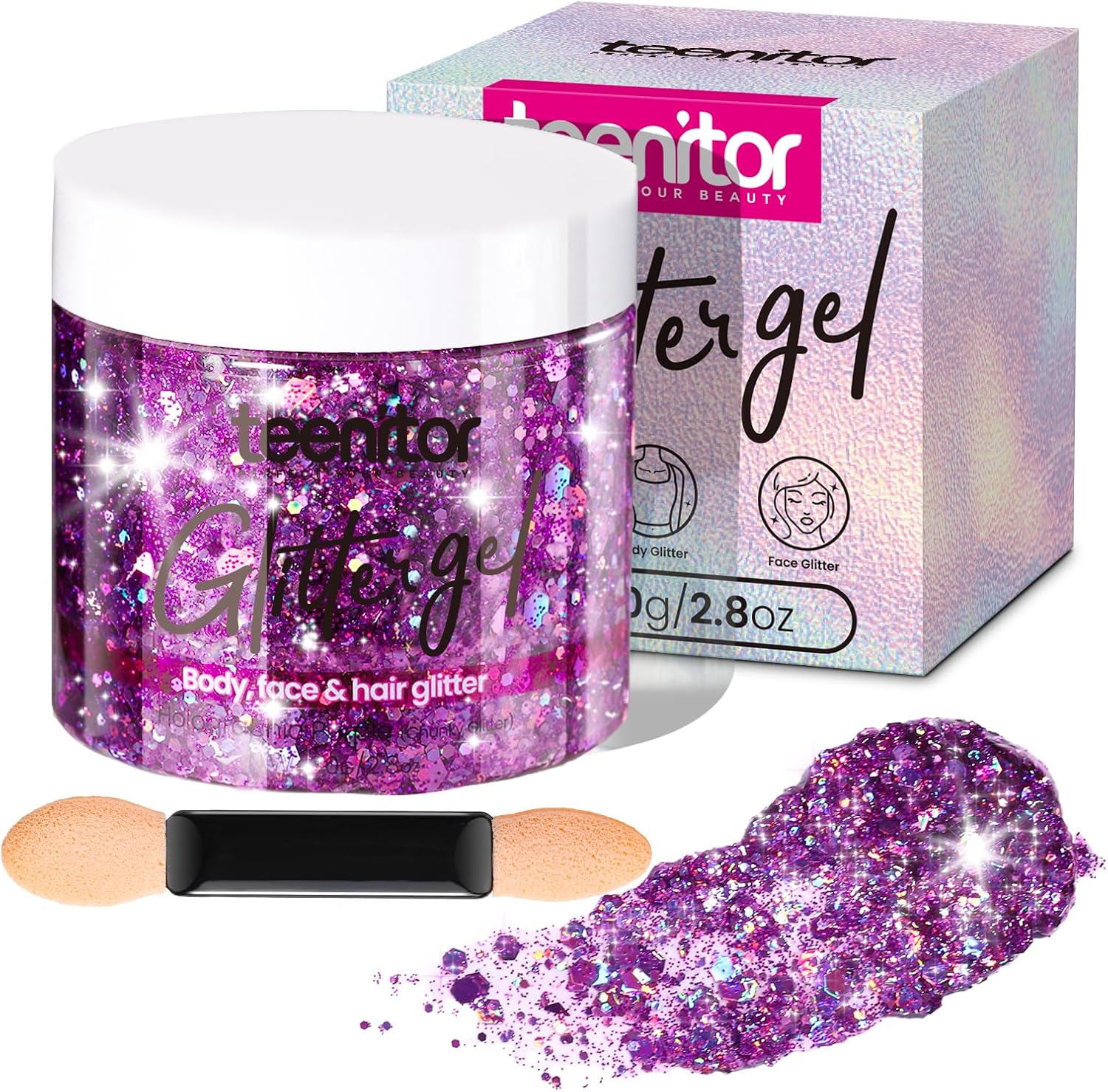 - Elevate your concert, carnival, or festival ensemble with a radiant burst of purple shimmer that infuses your outfit with unparalleled allure. Crafted with a premium, gel-based formula, Teenitor Purple Body Glitter Gel is specifically tailored for face and body makeup. It glides seamlessly over your skin, creating a luminous, festival-ready glow that's sure to catch the spotlight.