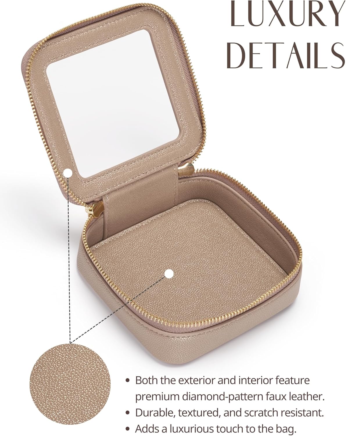 - [Premium Material and Durability] – The clear small cosmetic case, both the exterior and interior, is crafted from diamond-pattern faux leather, which is highly scratch resistant, durable and exceptionally easy to keep clean. It features a smooth zipper for secure closure, and elegant light gold metal hardware accents, adding a luxurious and sophisticated touch to the bag's overall design.