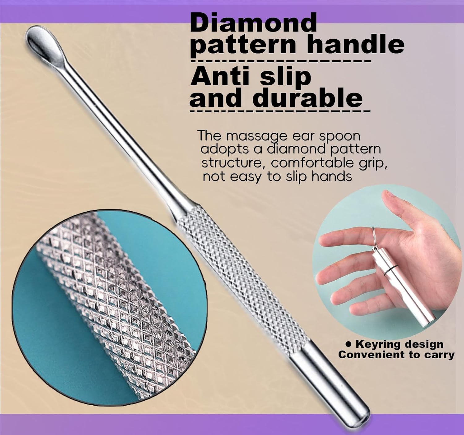 - Unique Design: The handle features a diamond patterned mesh for anti slip design, making it less likely for the ears to slip off and providing peace of mind during use. 4 different ear tips for ear cleaning small earwax and providing comfortable stress relief