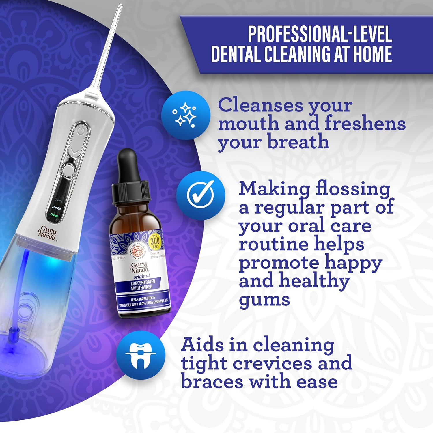 - STRONG SMILE: Built for a resilient smile, this GuruNanda kit includes an Advanced Dental Water Flosser with UV Light, Concentrated Mouthwash, Cocomint Pulling Oil, Butter on Gums Toothbrush, & Tongue Cleaner for reinforced oral hygiene.