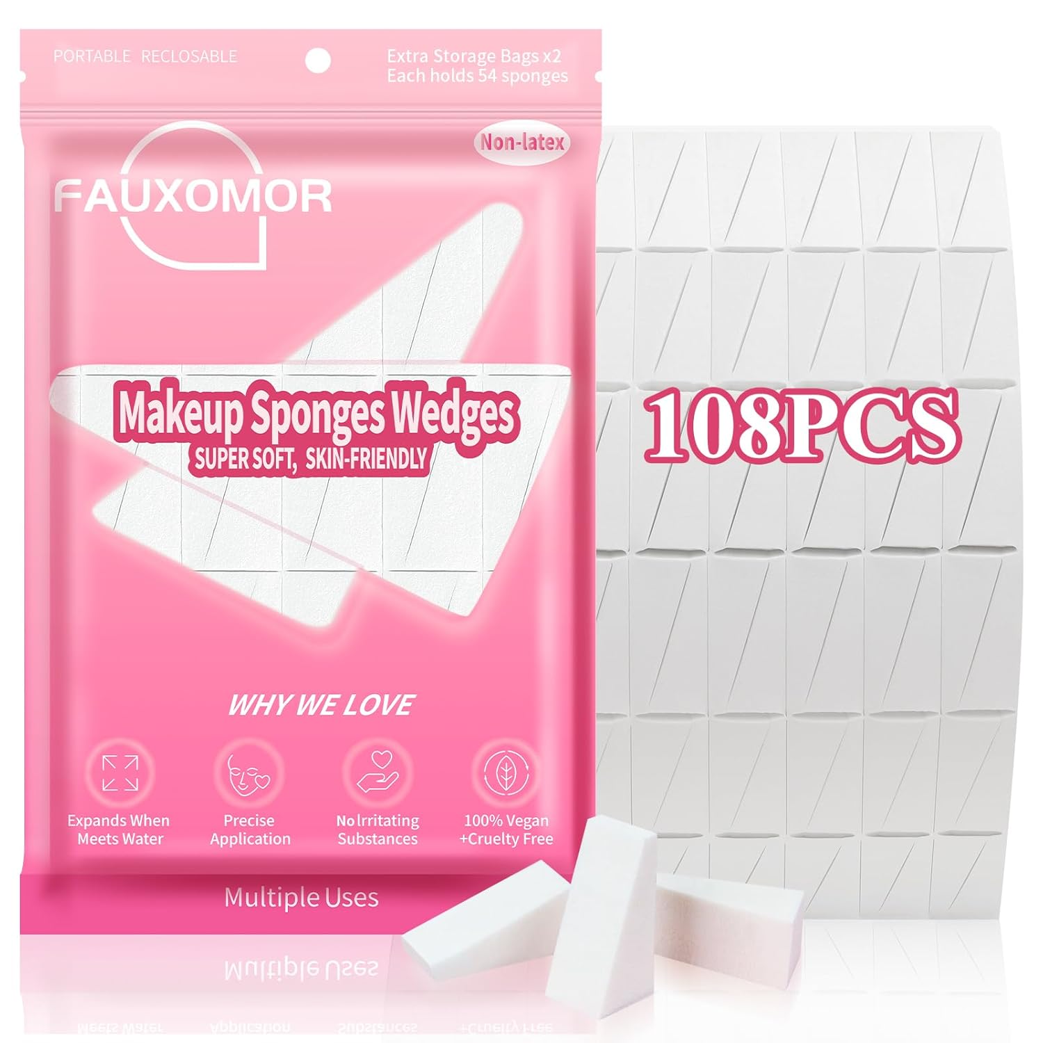 108 Pcs New Makeup Sponges Wedges for Face Foundation, Latex-Free Triangle Cosmetic Make Up Sponge for Flawless Application and Blending, Beauty Blender for All Skin Types with Two Pouches