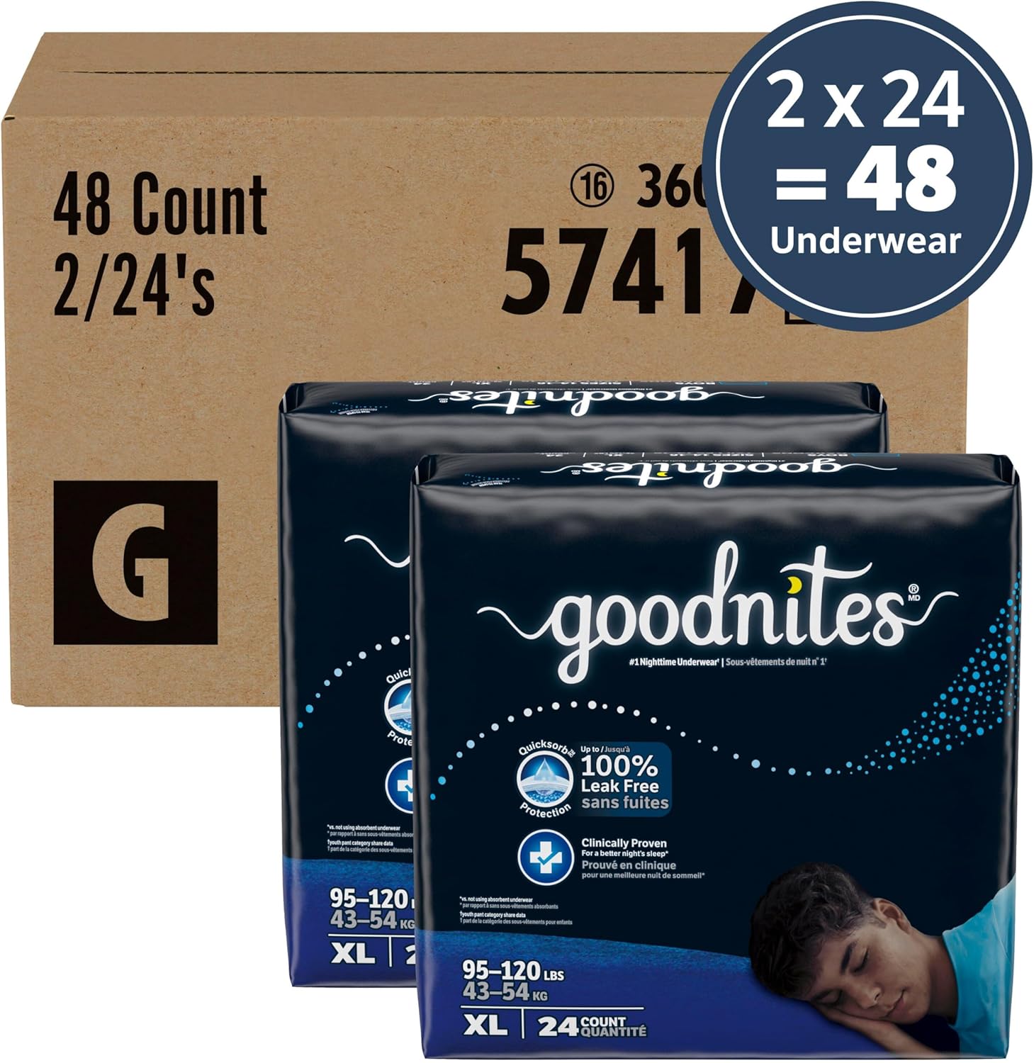 - Goodnites Boys' Nighttime Bedwetting Underwear: 48 (2 packs of 24) overnight underwear for boys, size extra large; fits children 95-120 lbs, packaging may vary