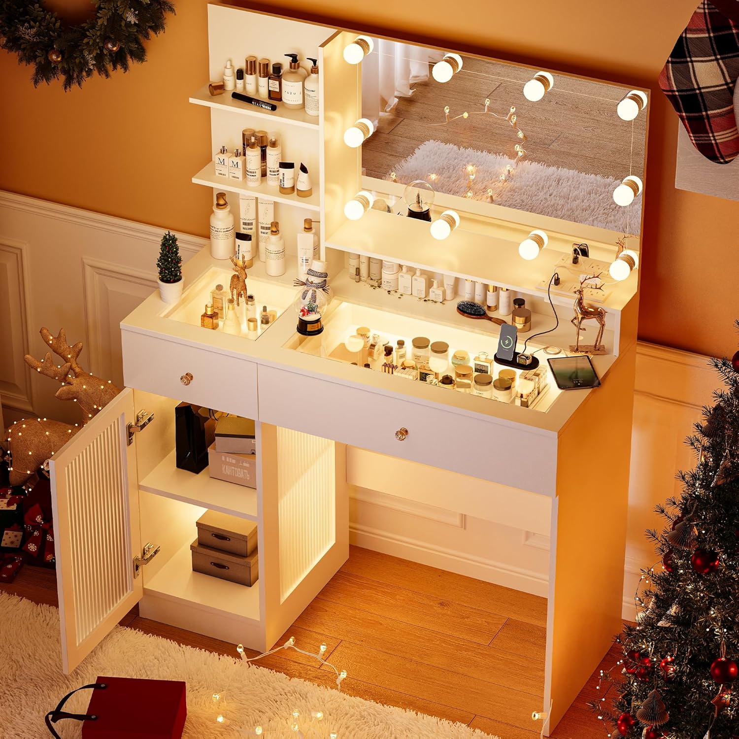 - 【Ample Storage Space】white vanity with lighted mirror offers a compact design without compromising on storage capacity. With 2 drawer, 3 shelves, and a acrylic 2-tier storage cabinet, you can easily store and access all your makeup essentials, jewelry, perfumes, hair straighteners, and more.