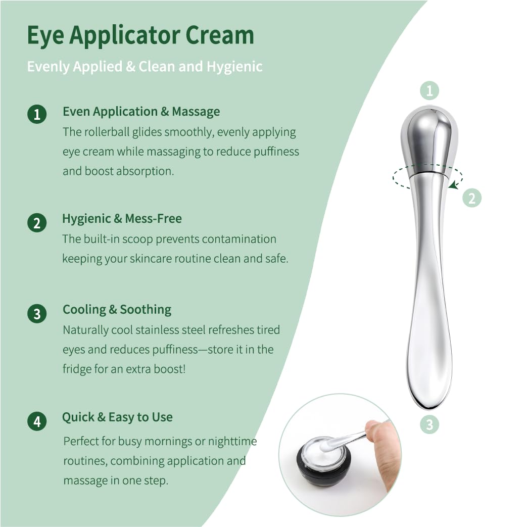 - Eye Cream Applicator: This rotating applicator rolls on the eye area, aiding cream absorption, reducing puffiness and fatigue. The tail for scooping avoids direct contact, ensuring a cleaner use.