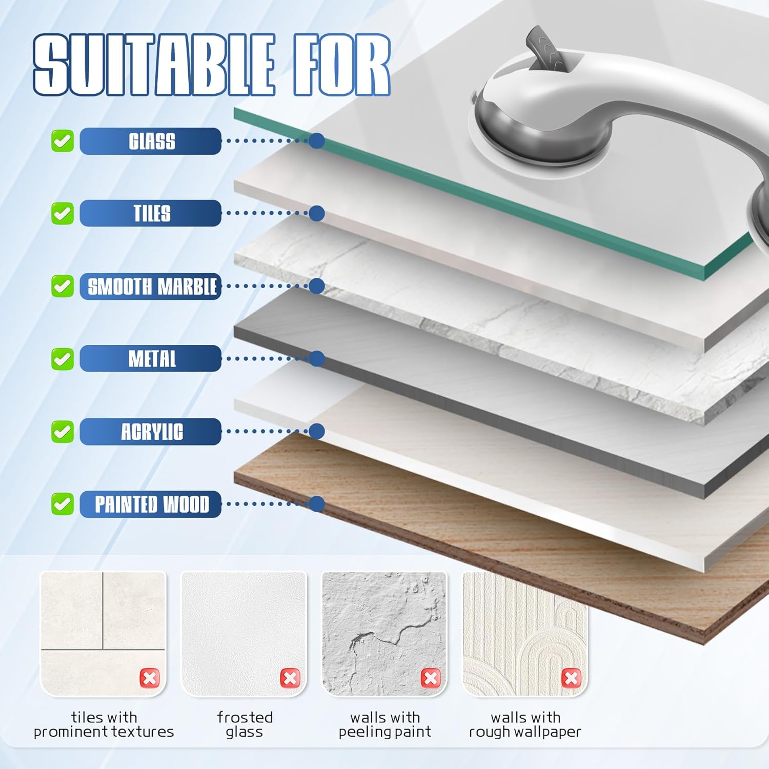 - For Smooth Surfaces Only - The shower safety bars for seniors works best on non-porous surfaces like glass, ceramic tile, marble, metal, acrylic, or lacquered wood. Not suitable for grout lines or textured walls. Always check suction weekly—especially when the grab bar used by children, seniors, or post-surgery.