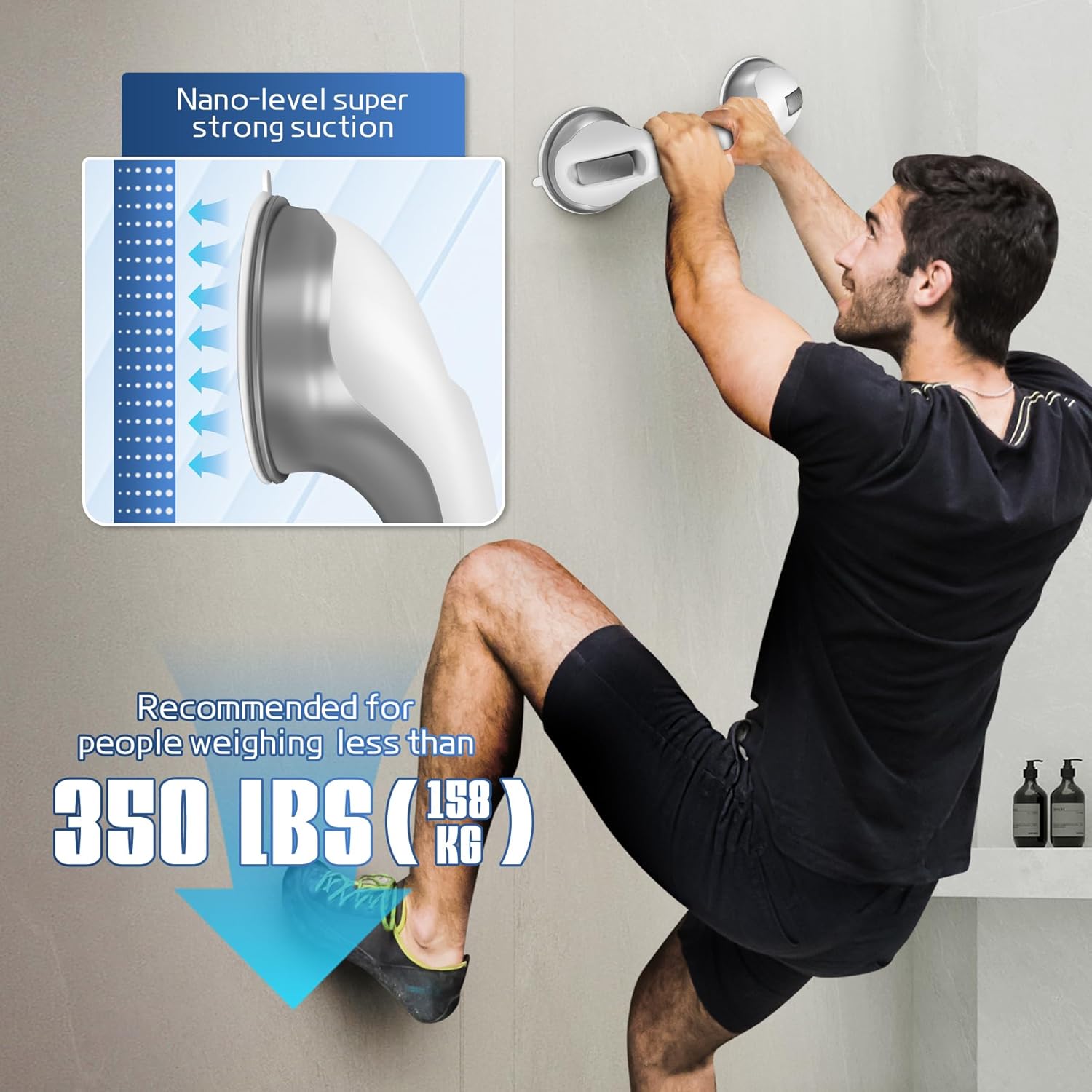 - Comfort Grip, Long-Lasting Build - Shower grab bars suction crafted from durable plastic with flexible rubber suction cups, the ergonomic shower handle offer a secure, non-slip grip. Measuring 12" × 3.9", the grab bars for shower are perfectly sized for daily stability and comfort.