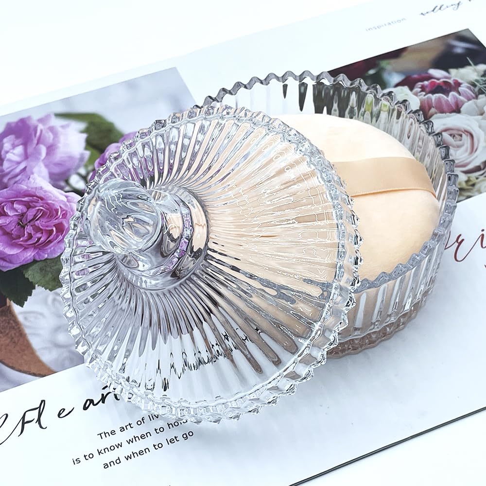 - Decorative Glass Powder Jar:The powder puff jar is made of high-quality glass, which is thick and sturdy. The design is elegant and luxurious for long-lasting beauty, making a instant décor upgrade for your dressing table, bathroom,nurseries, or vintage-themed rooms.