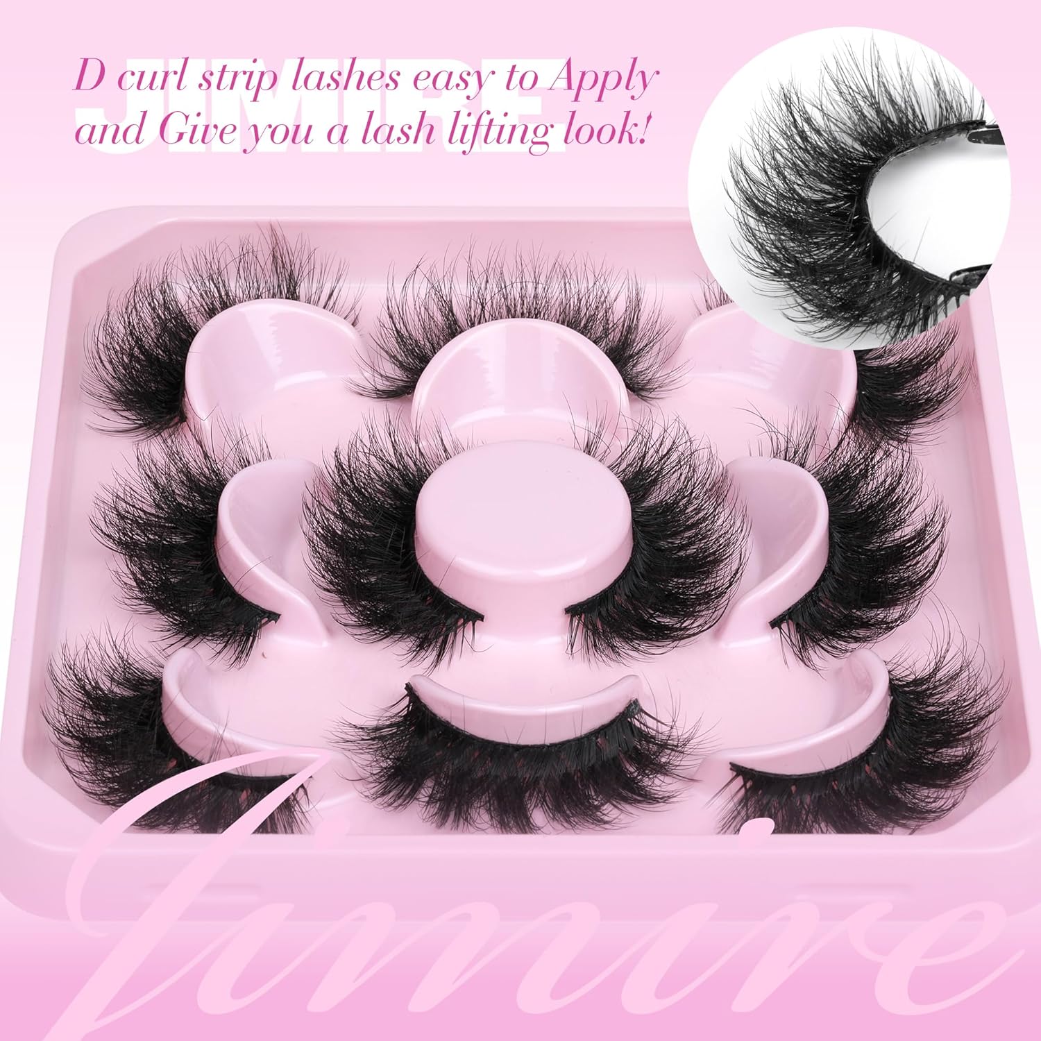 JIMIRE False Eyelashes Volume Natural Look Russian Strip D Curl Lashes Wispy 17MM Cat Eye Lashes Look Like Lash Extensions Mink Fluffy 5 Pairs Pack