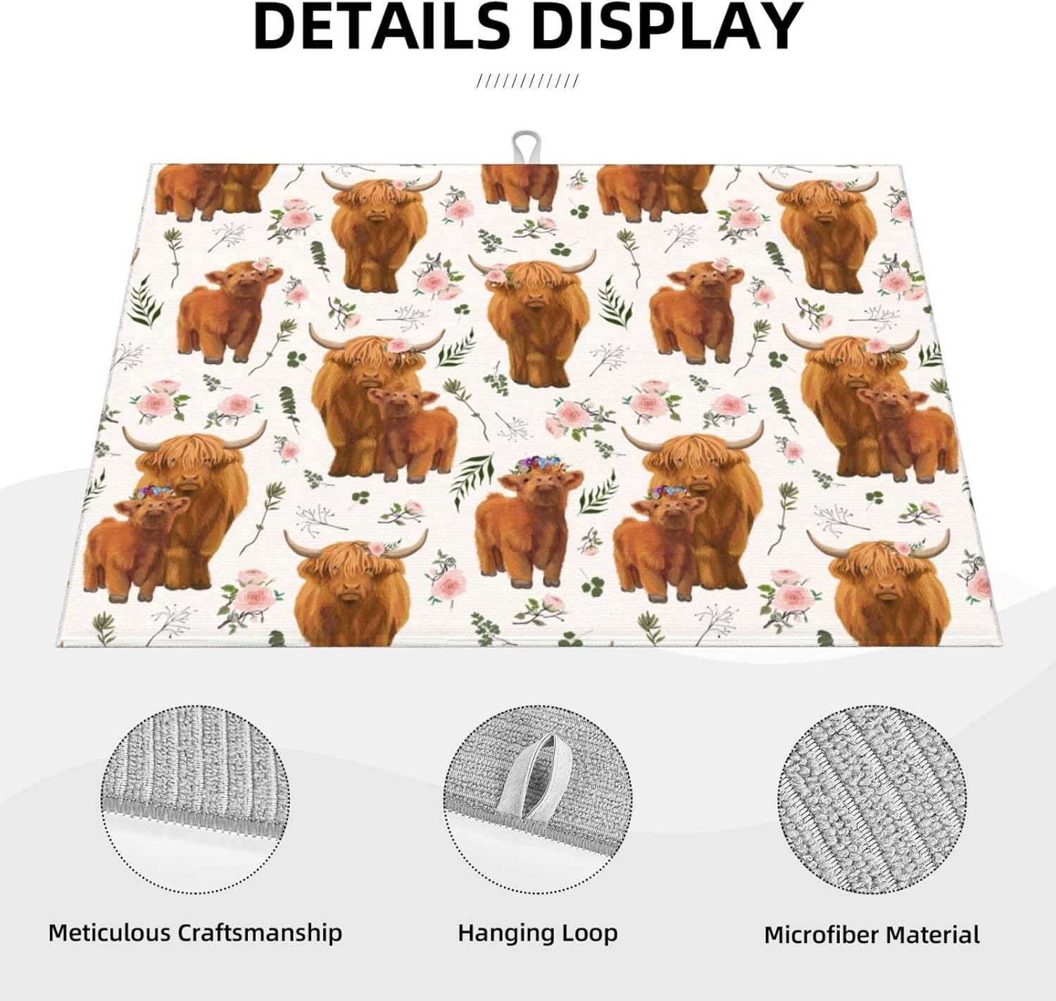 Highland Cow Dish Drying Mat for Kitchen Counter Cute Kitchen Mat Microfiber Kitchen Countertop Absorbent Reversible Drainer Rack Pad Dish Drying Mat 18 x 24 Inch