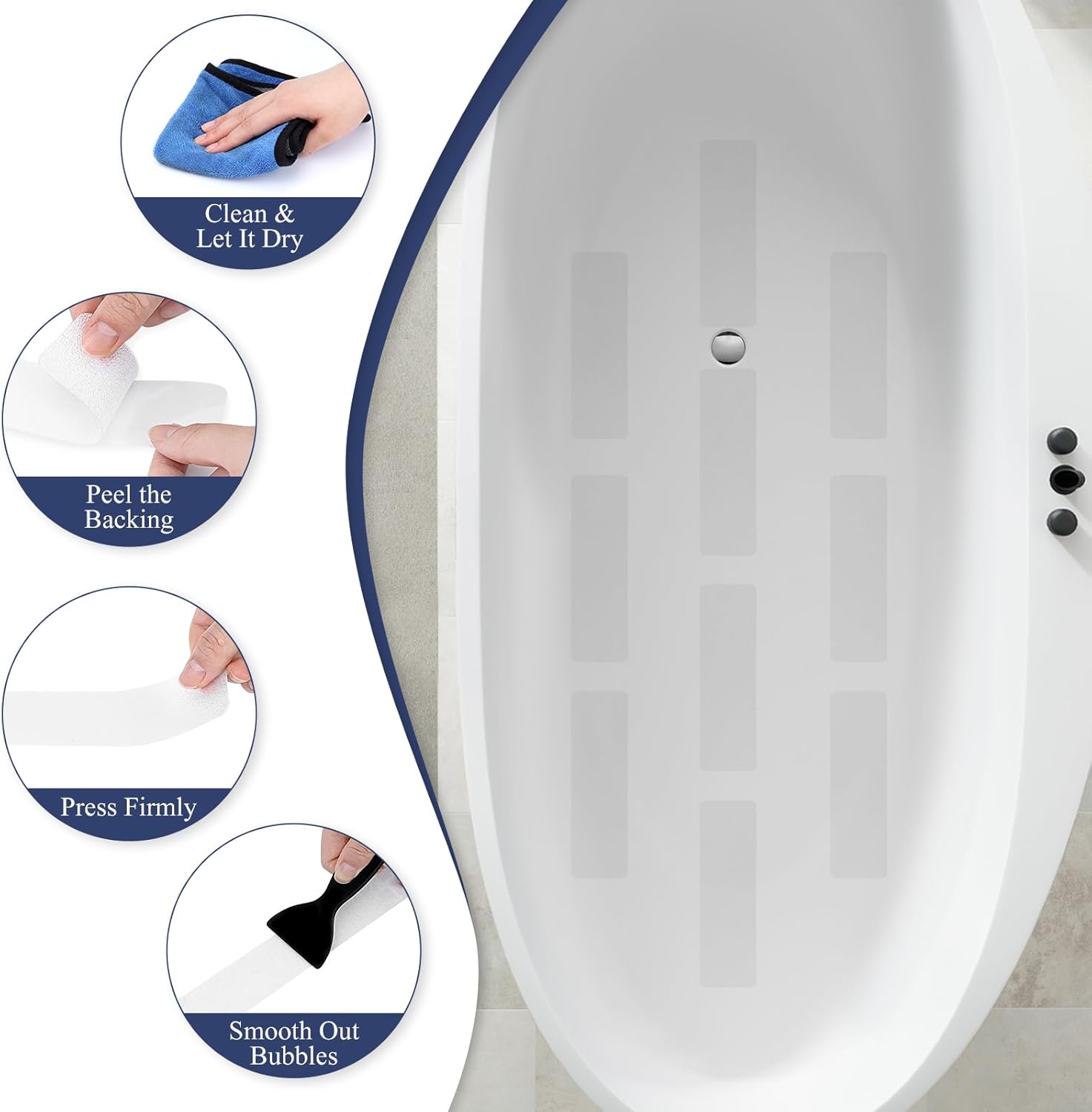- Easy to Apply & Remove: Clean and dry the surface, peel the non slip shower stickers, smooth them on, and use a squeegee to remove bubbles.Resist curling and remain residue-free over time. Peel off effortlessly, leaving no sticky residue behind