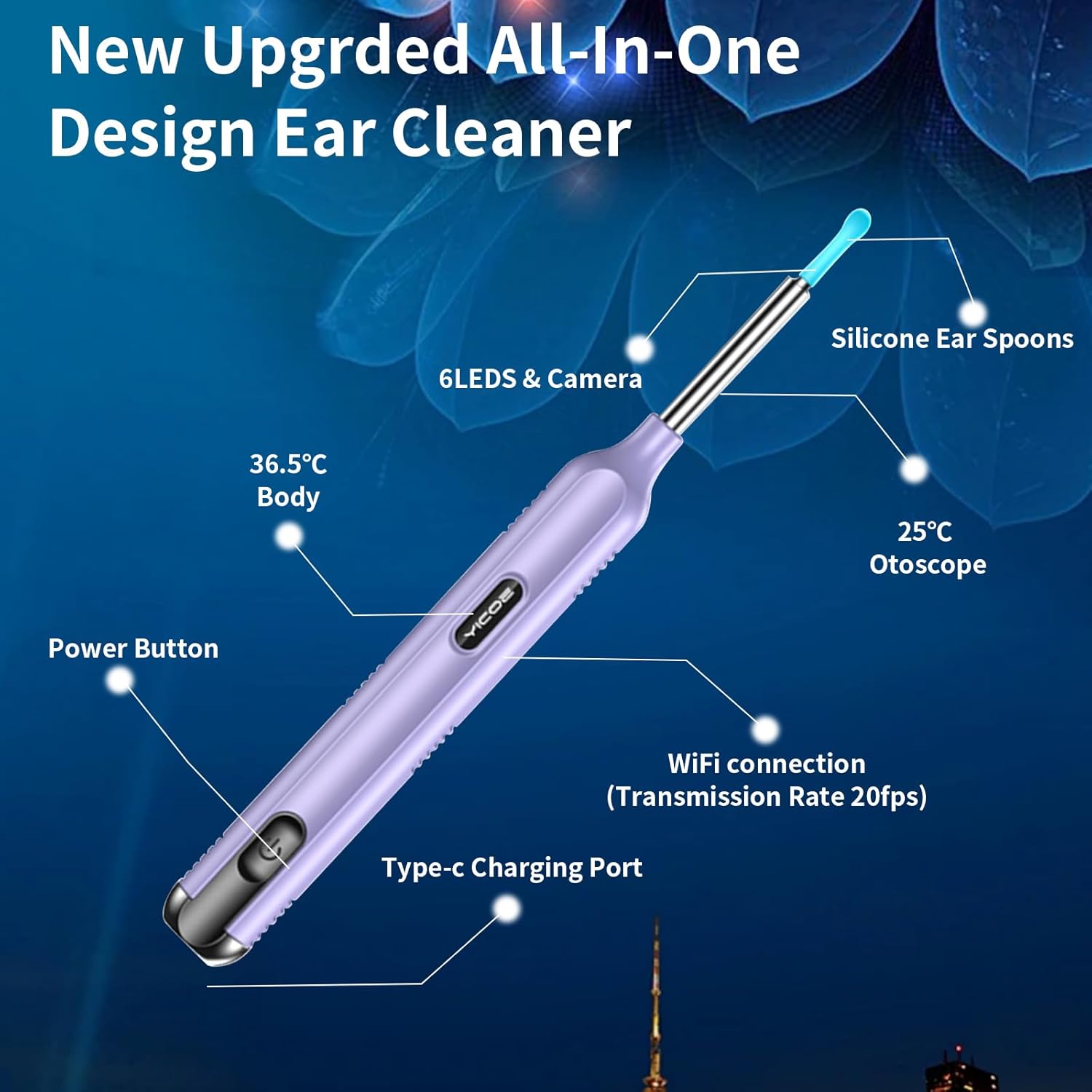 - 1200P HD Camera & 360° Wide Angle: This ear wax cleaner with camera is equipped with a 1200P HD camera and 6 LED lights to help you observe and clean earwax effectively. In addition to being an ear scope otoscope with light, you can also take HD pictures and videos in real time and have a wide field of view. With these features, earwax removal kit becomes safer and more convenient