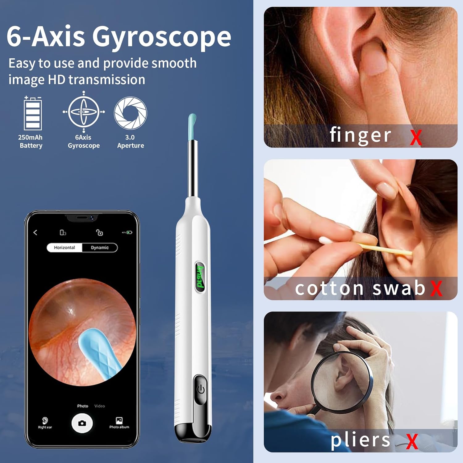 - 1200P HD Camera & 360° Wide Angle: This ear wax cleaner with camera is equipped with a 1200P HD camera and 6 LED lights to help you observe and clean earwax effectively. In addition to being an ear scope otoscope with light, you can also take HD pictures and videos in real time and have a wide field of view. With these features, earwax removal kit becomes safer and more convenient