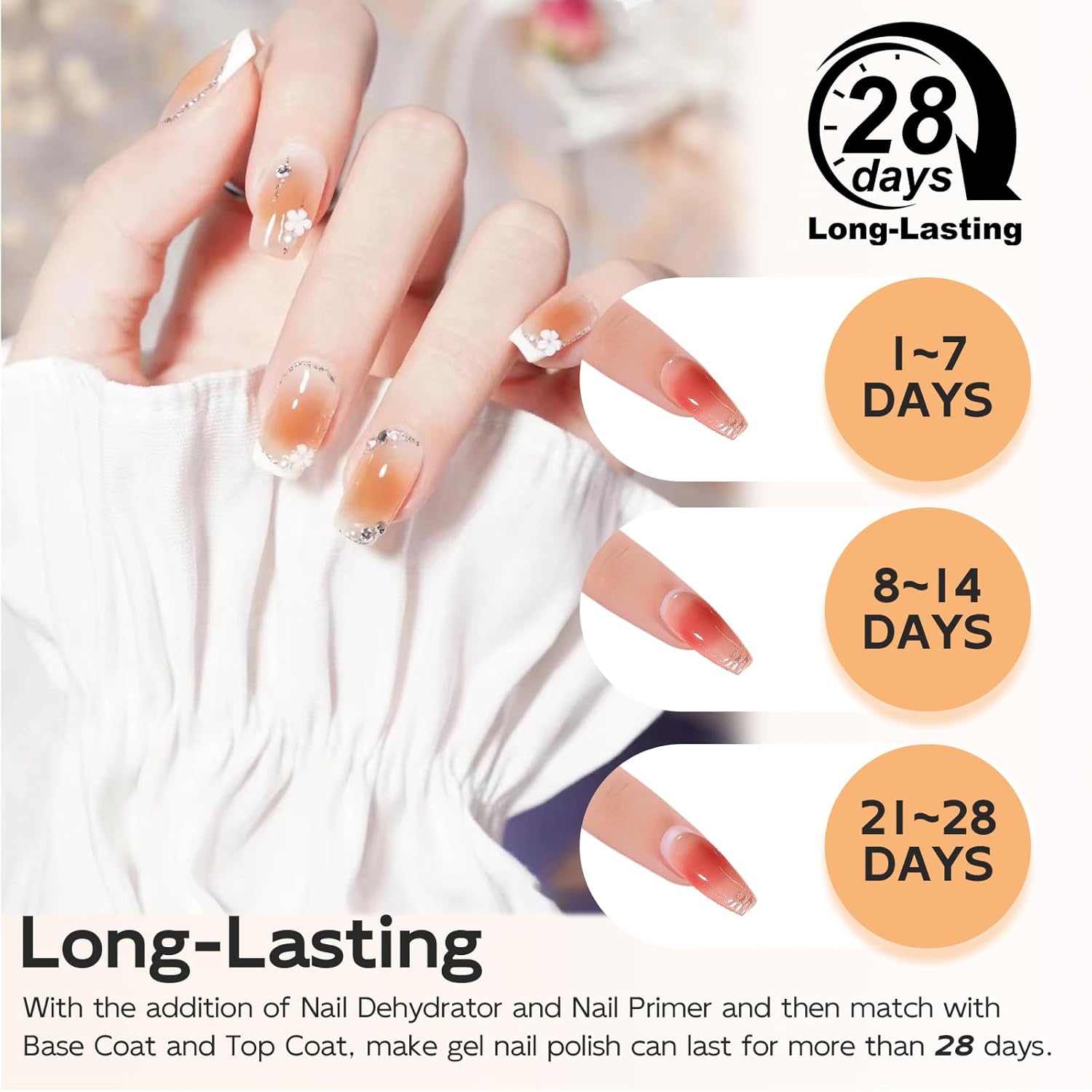 - Tips for preventing nail surface peeling off:(1) Polishing of the nail surface: Polish the front, side and trailing edge of the nail until there are no reflective spots on the nail surface(2) Nail surface cleaning: It is recommended to use ZODIAL Nail Dehydrator to remove oil and moisture from the nail surface(3) Lighting time: It is recommended that the lighting time for base Coat, Color Gel and Top Coat at least 60 seconds