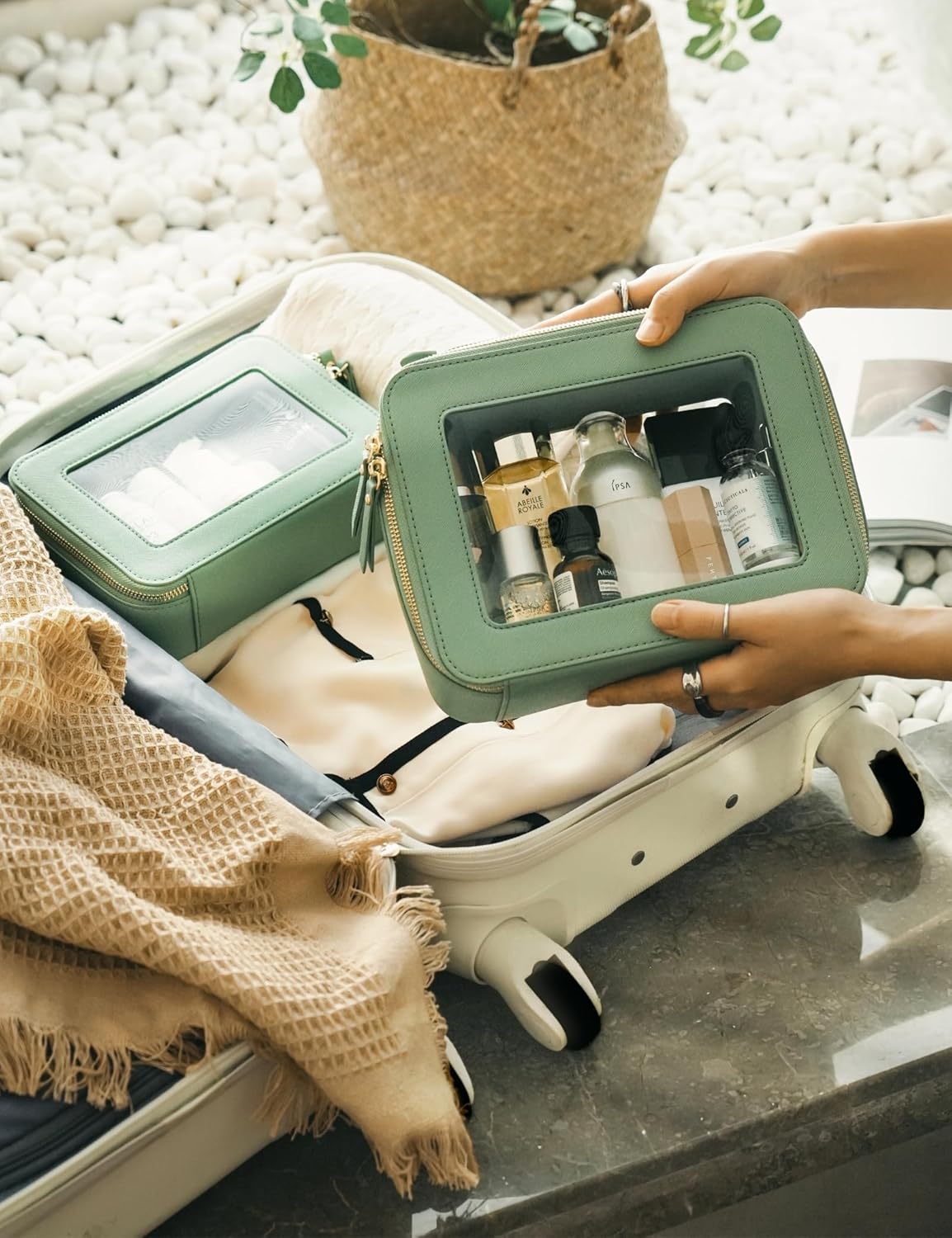 • [Premium Material and Durability] – The clear cosmetic case, both the exterior and interior, is crafted from high-grade saffiano faux leather, which is highly scratch resistant, durable and exceptionally easy to keep clean. It features a smooth zipper for secure closure, and elegant light gold metal hardware accents, adding a luxurious and sophisticated touch to the bag's overall design.