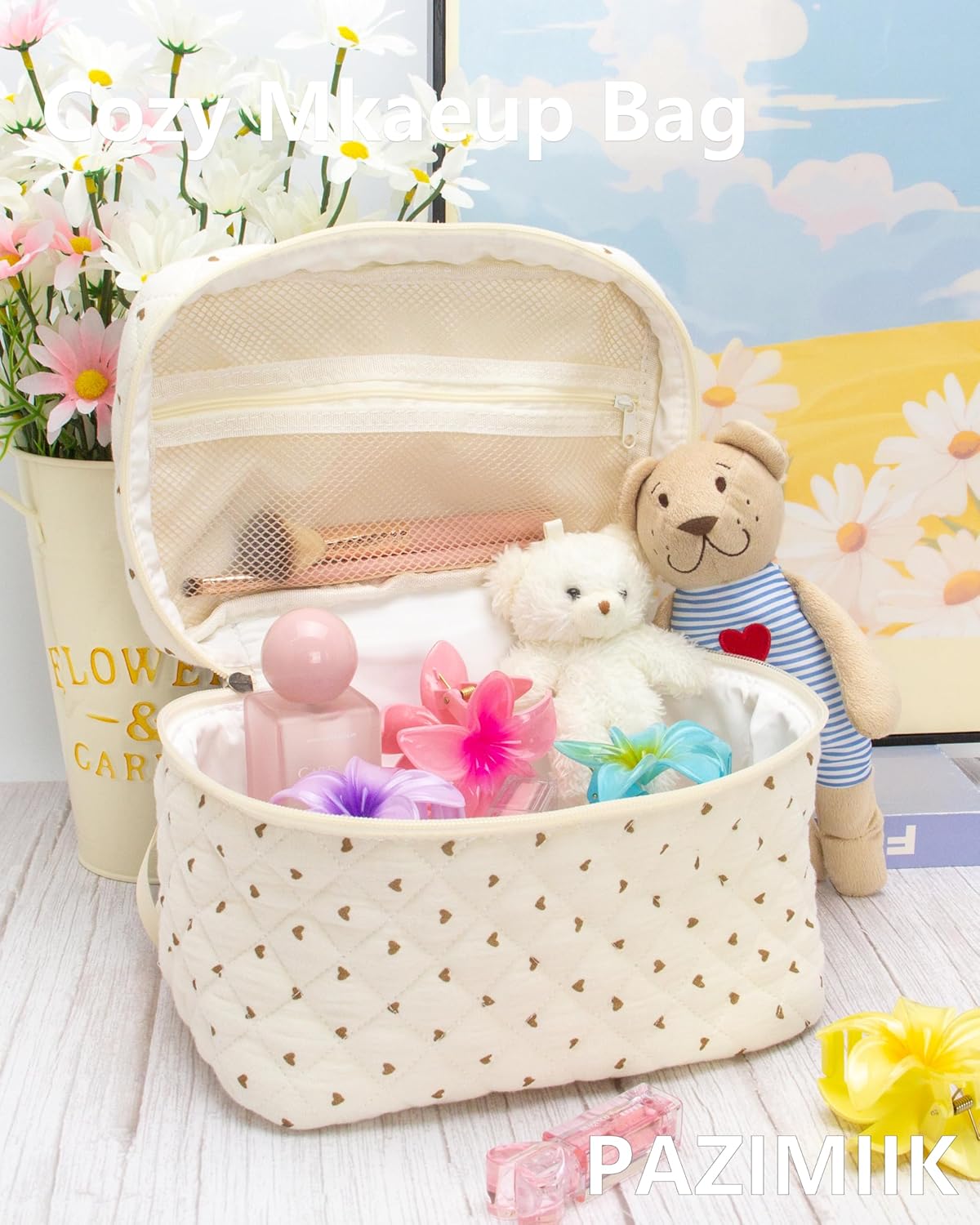 PAZIMIIK Quilted Makeup Bag Large Travel Zipper Soft Cosmetic Case for Women Girls Make Up,Gauze Heart Coffee