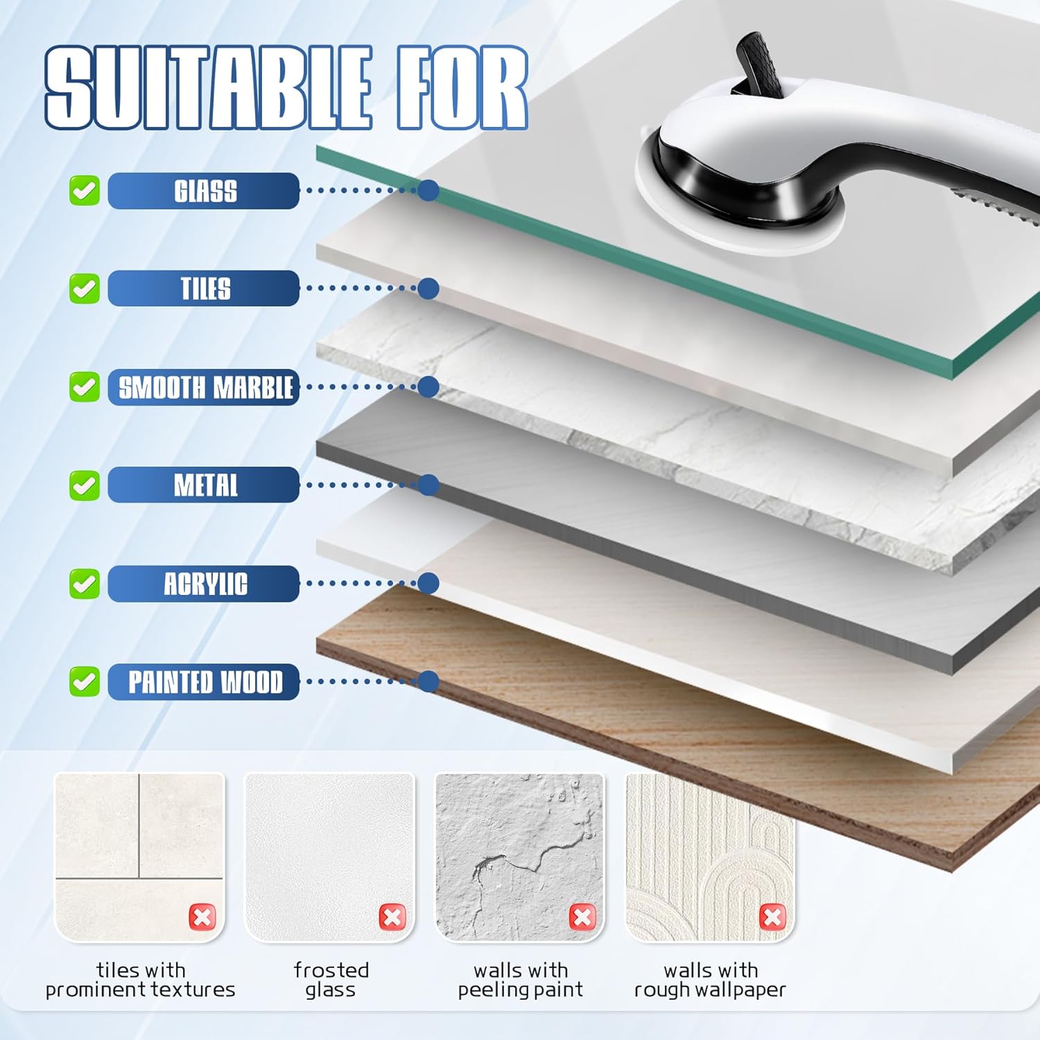 - For Smooth Surfaces Only - The shower safety bars for seniors works best on non-porous surfaces like glass, ceramic tile, marble, metal, acrylic, or lacquered wood. Not suitable for grout lines or textured walls. Always check suction weekly—especially when the grab bar used by children, seniors, or post-surgery.